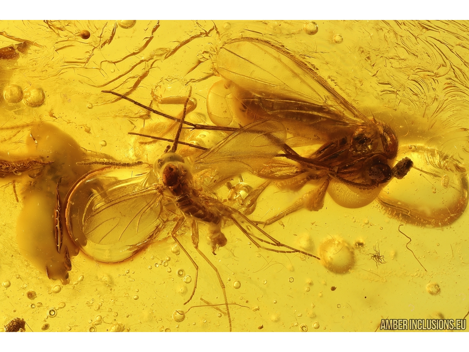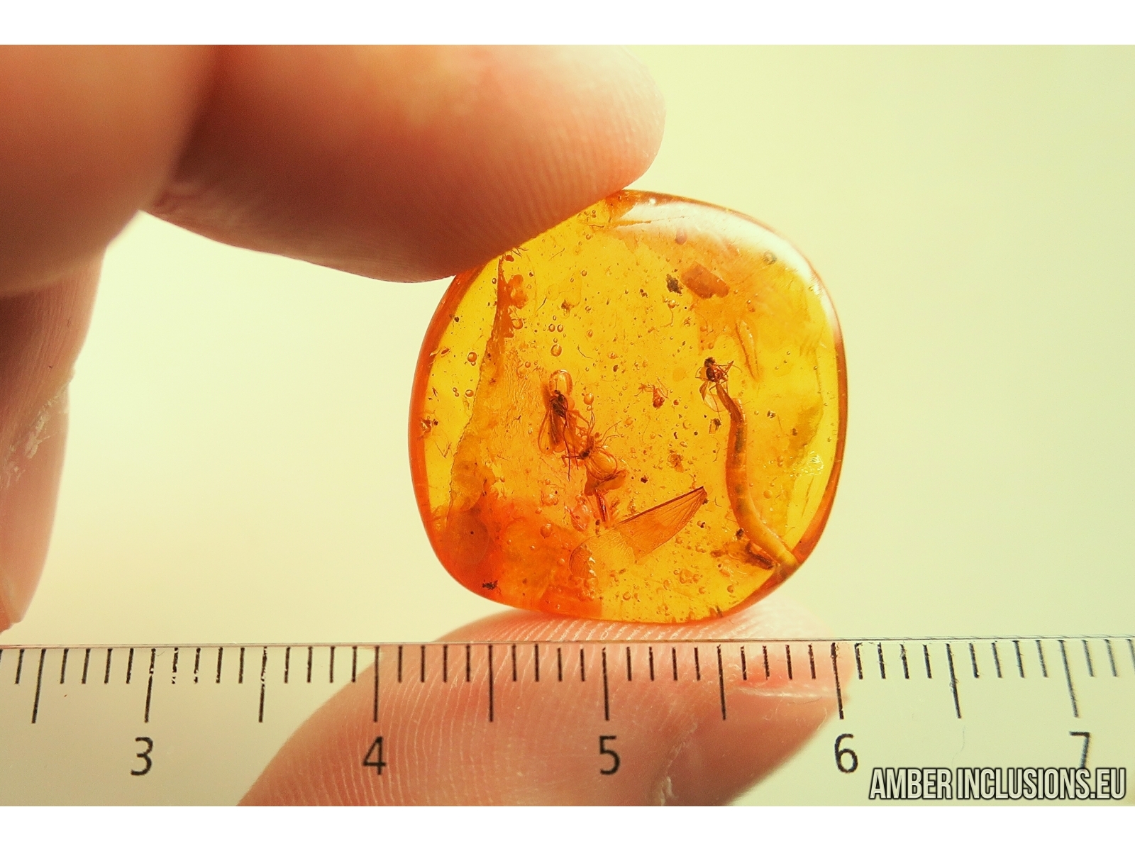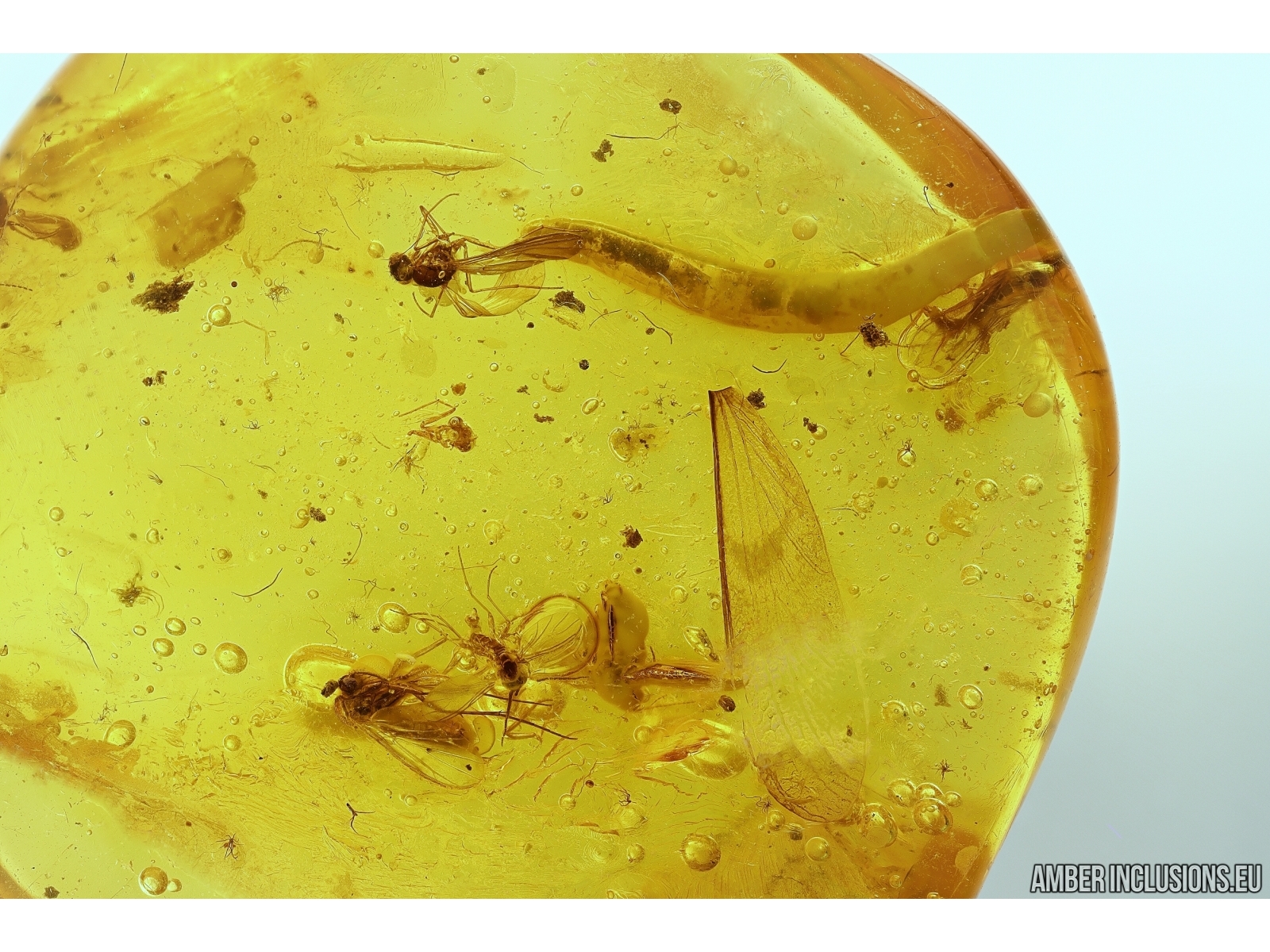 Baltic amber stone with fossil inclusions, trapped 34-56 million years ago - Nice Larva and many Dipterans.