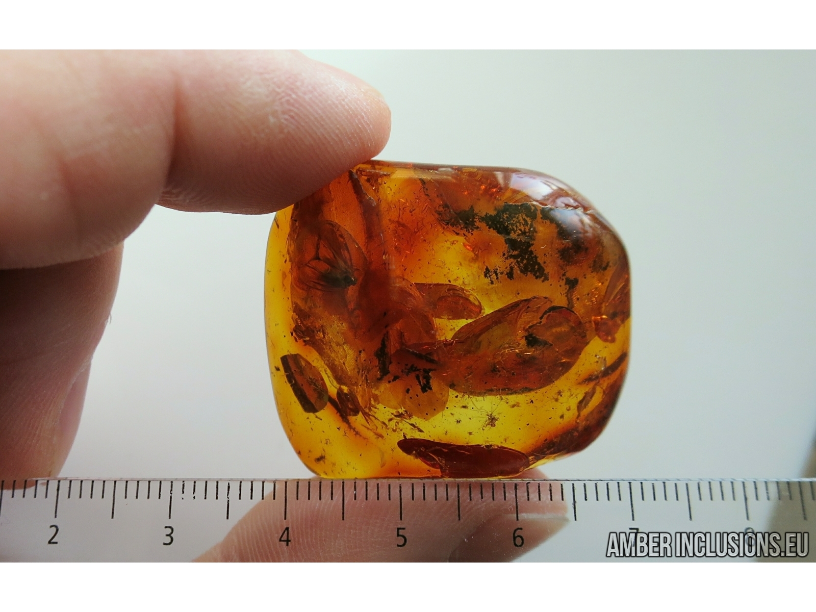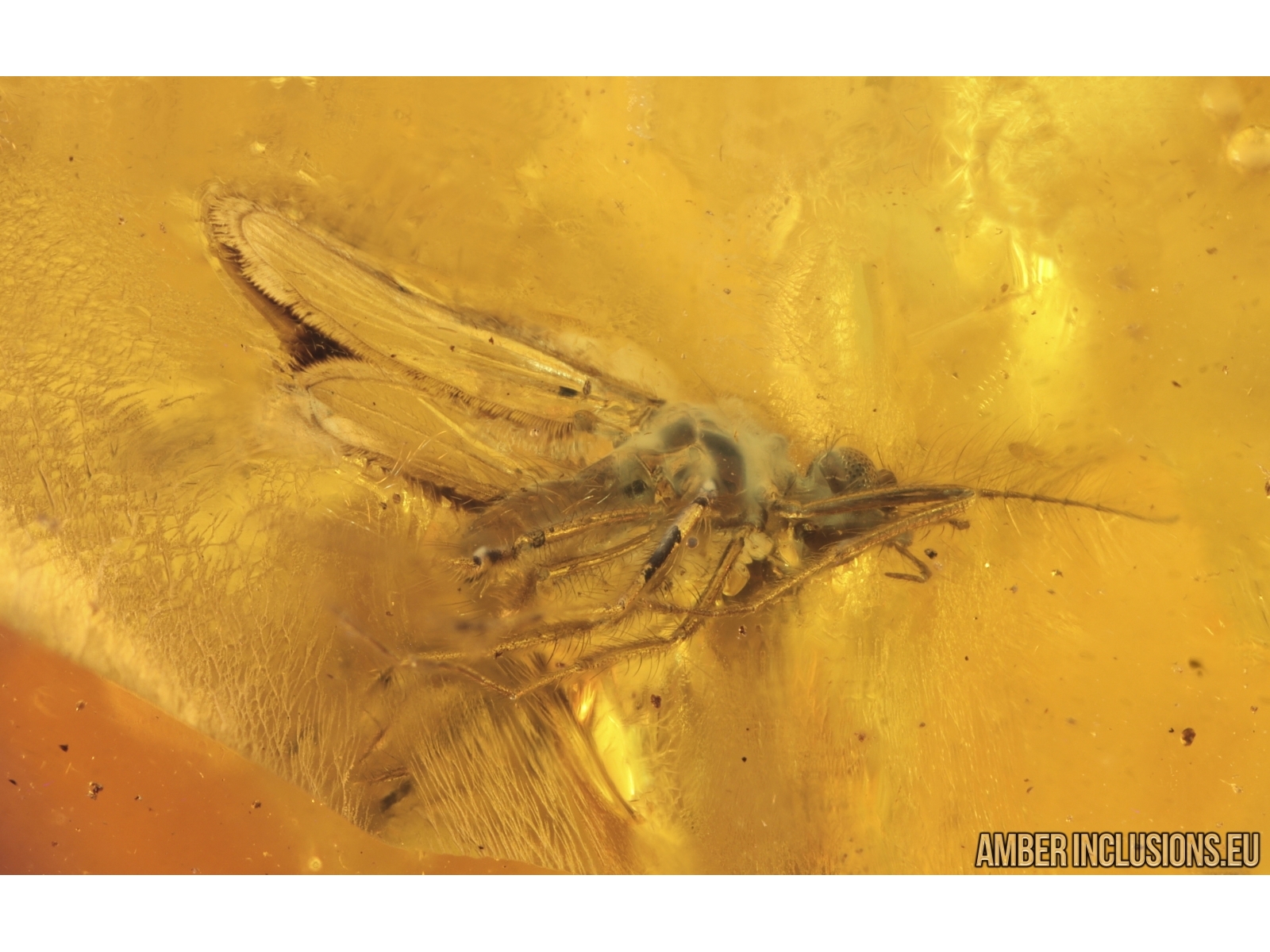 It weighs 8.4 g. Measurements of stone 36x29x12mm, length of planthopper ~4mm, midge ~1.5mm.