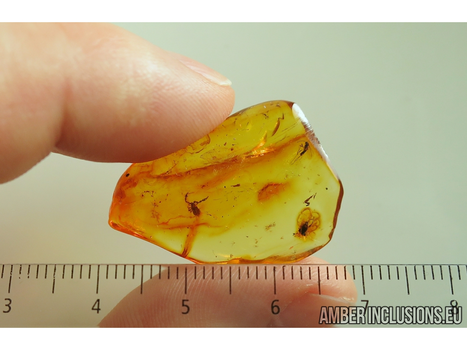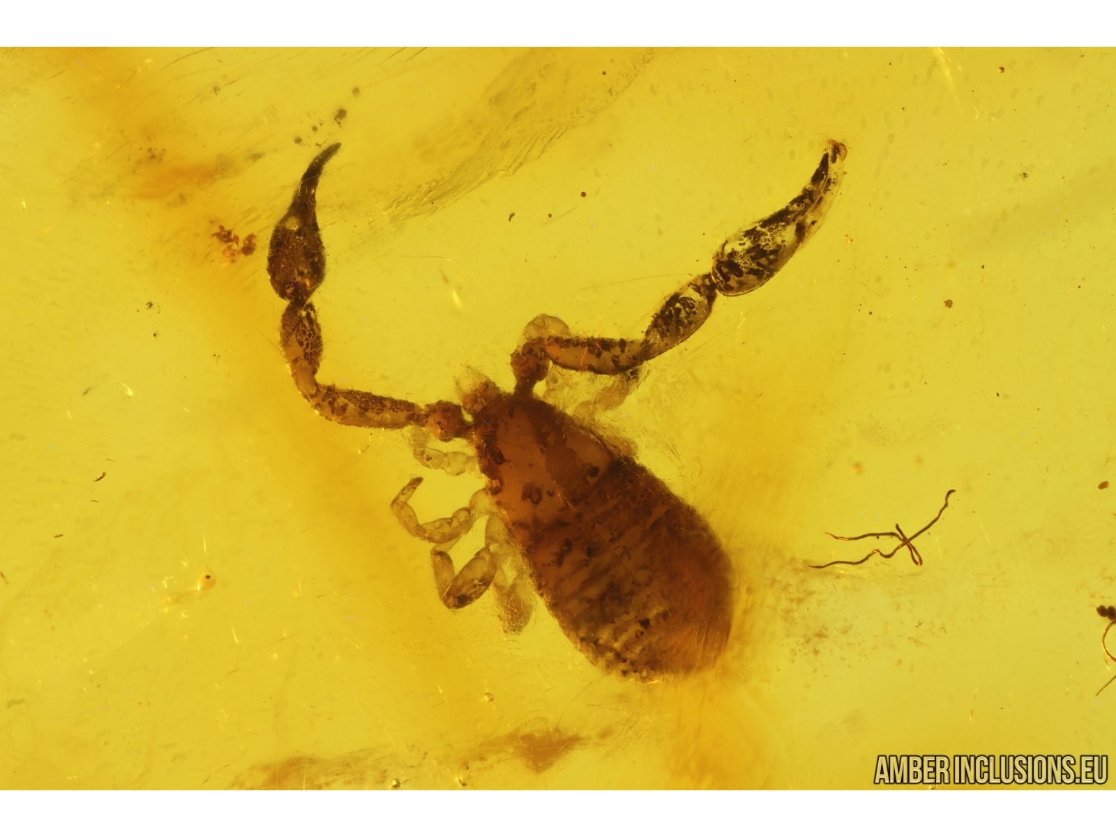 It weighs 1.9 g. Measurements of stone 29x21x5mm, length of pseudoscorpion ~3.5mm