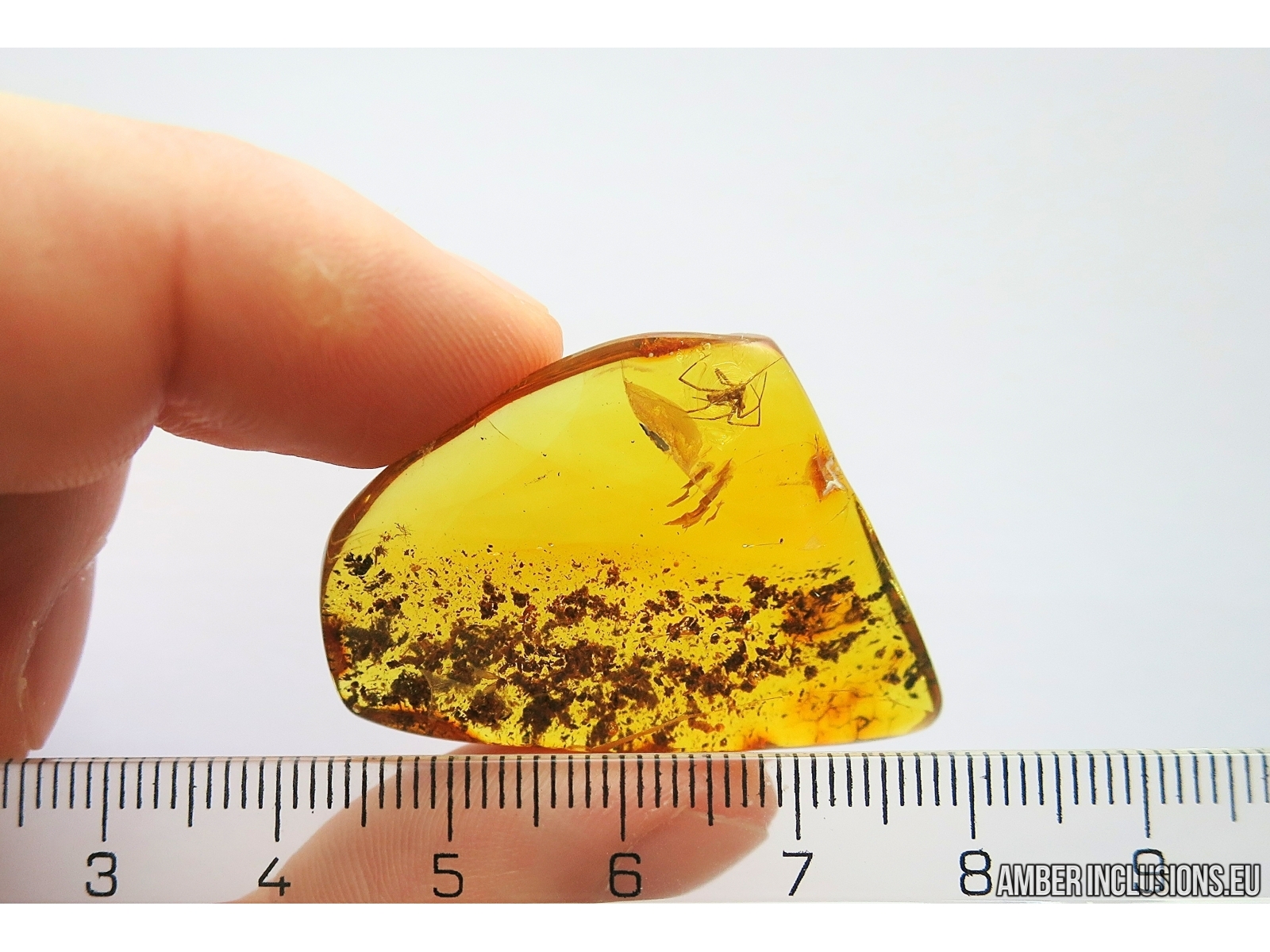 It weighs 6 g. Measurements of stone 40x27x10mm, length of spider body ~2.1mm, max ~5mm.
