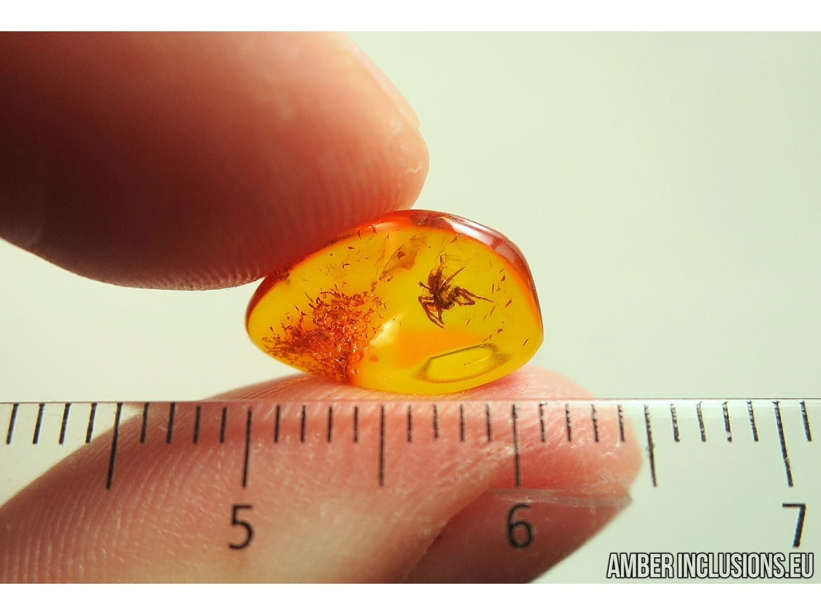 It weighs 0.3 g. Measurements of stone 12x8x5mm, length of spider ~2mm.