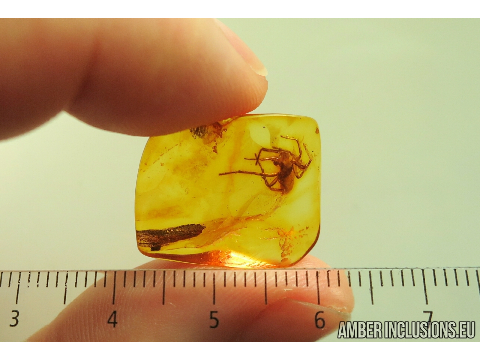 It weighs 1.5 g. Measurements of stone 21x16x5mm, length of spider body ~4.5mm, max ~10mm.