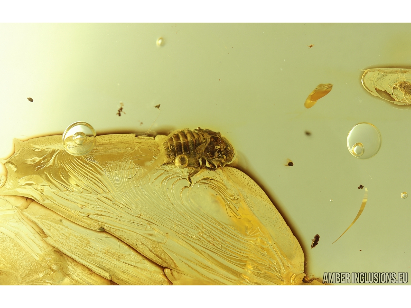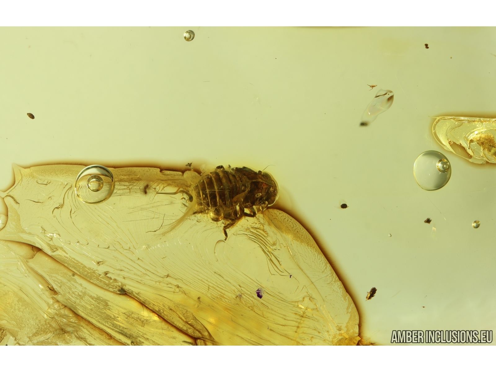 Ukrainian Rovno amber stone with fossil inclusions, trapped 34-56 million years ago -Planthopper nymph Fulgoromorpha and Water bubbles