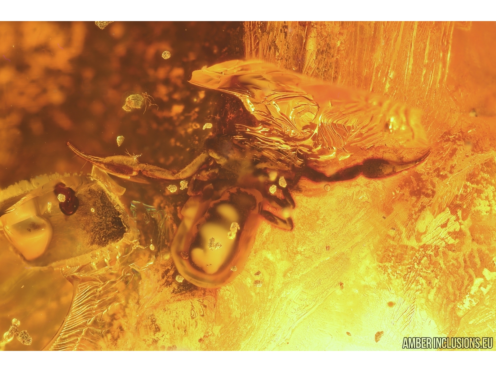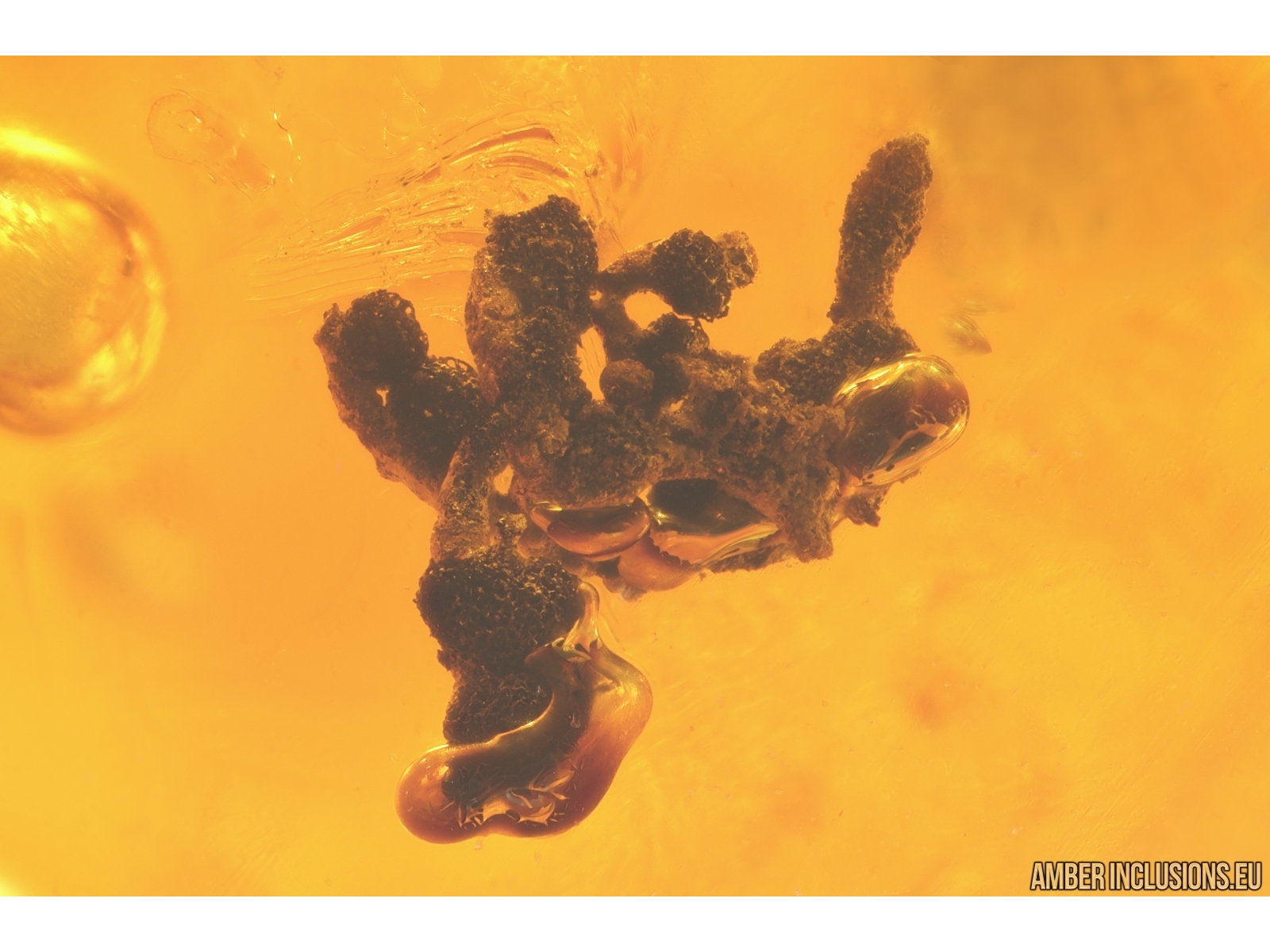 Baltic amber stone with fossil inclusion, trapped 34-56 million years ago - Pseudoscorpion and Plant Lichen