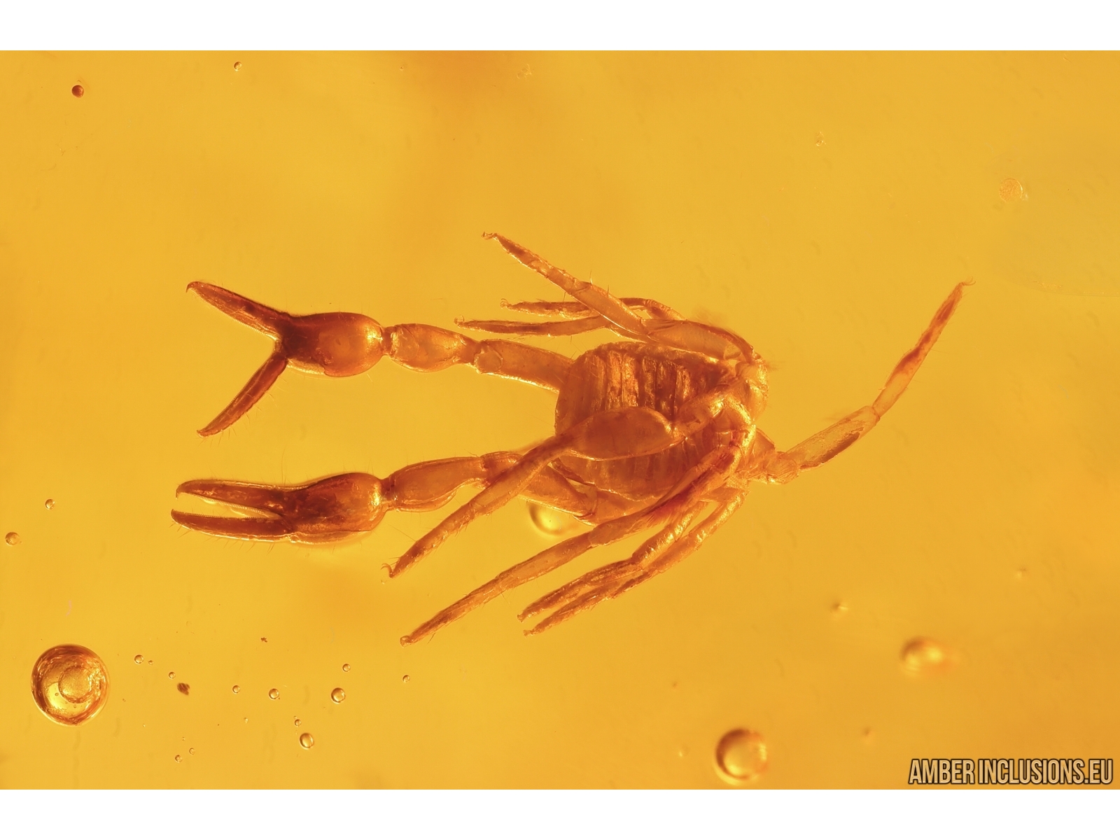 Amber Inclusions » PSEUDOSCORPIONS, PSEUDOSCORPIONES » Pseudoscorpion and Two Spiders. Fossil inclusions in Big 39g Baltic amber stone with natural hole #12780