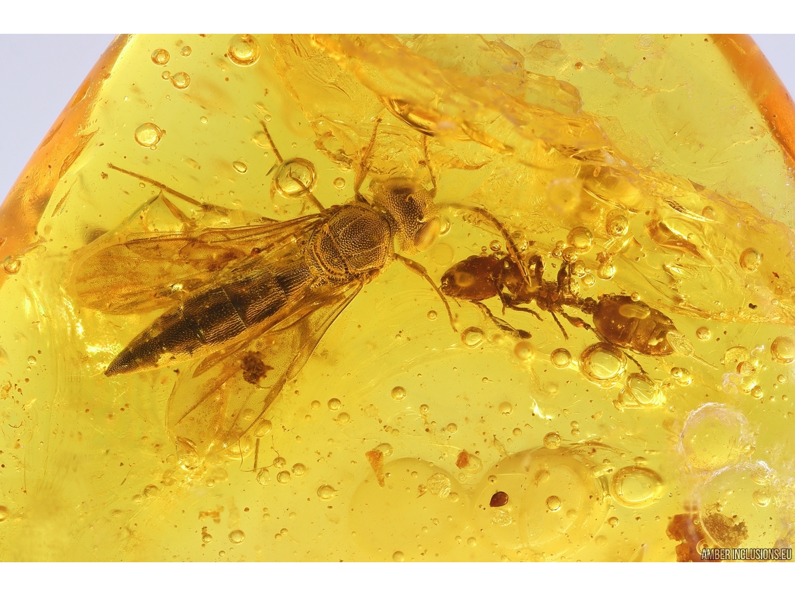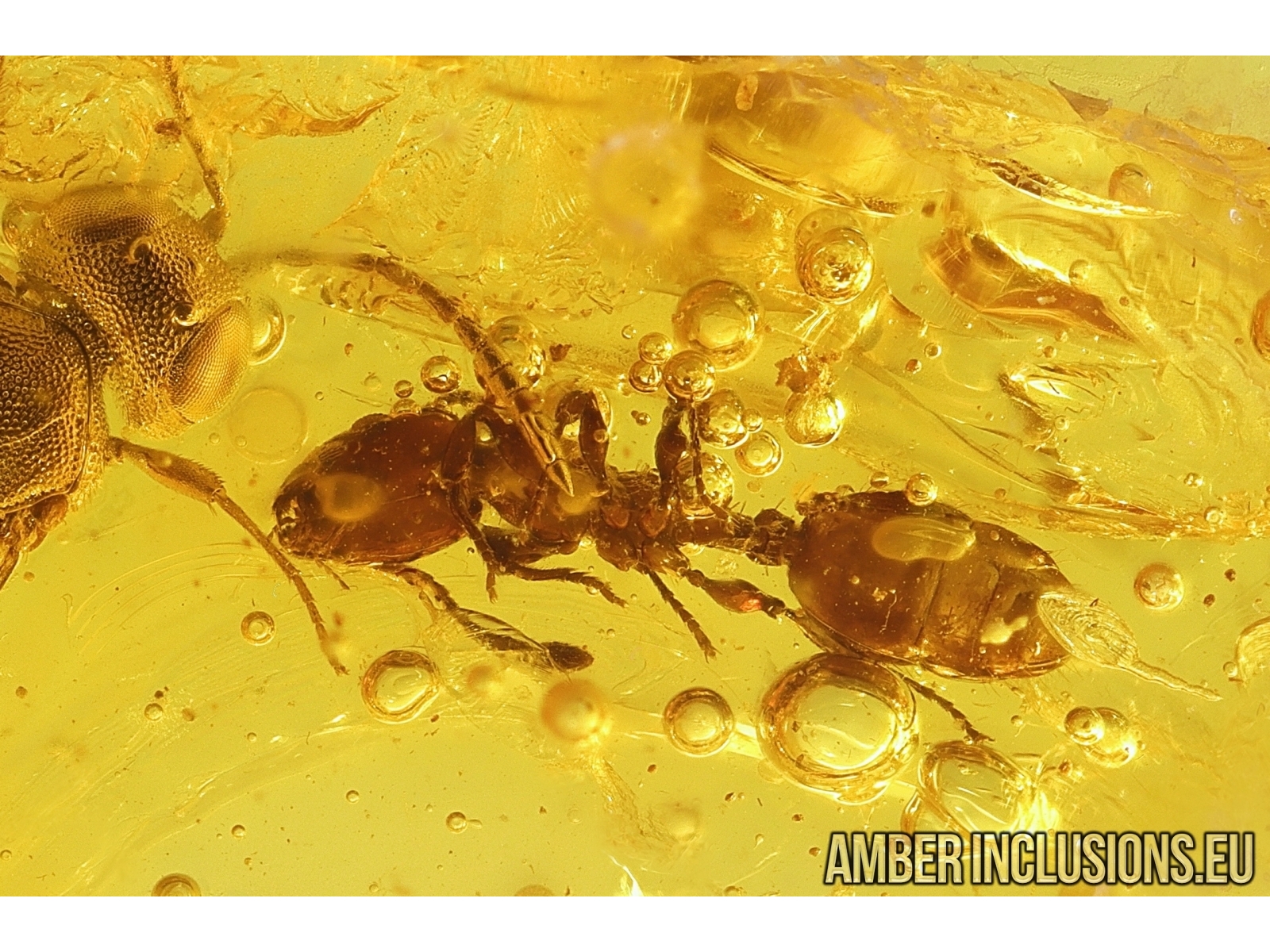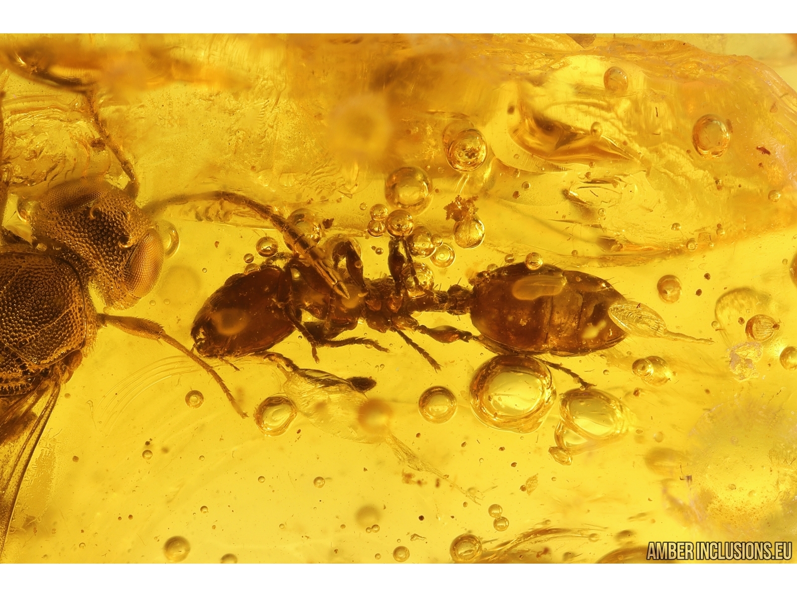 Baltic amber stone with fossil inclusions, trapped 34-56 million years ago - Rare Ant Formicidae Eotemnothorax gracilis and Wasp.