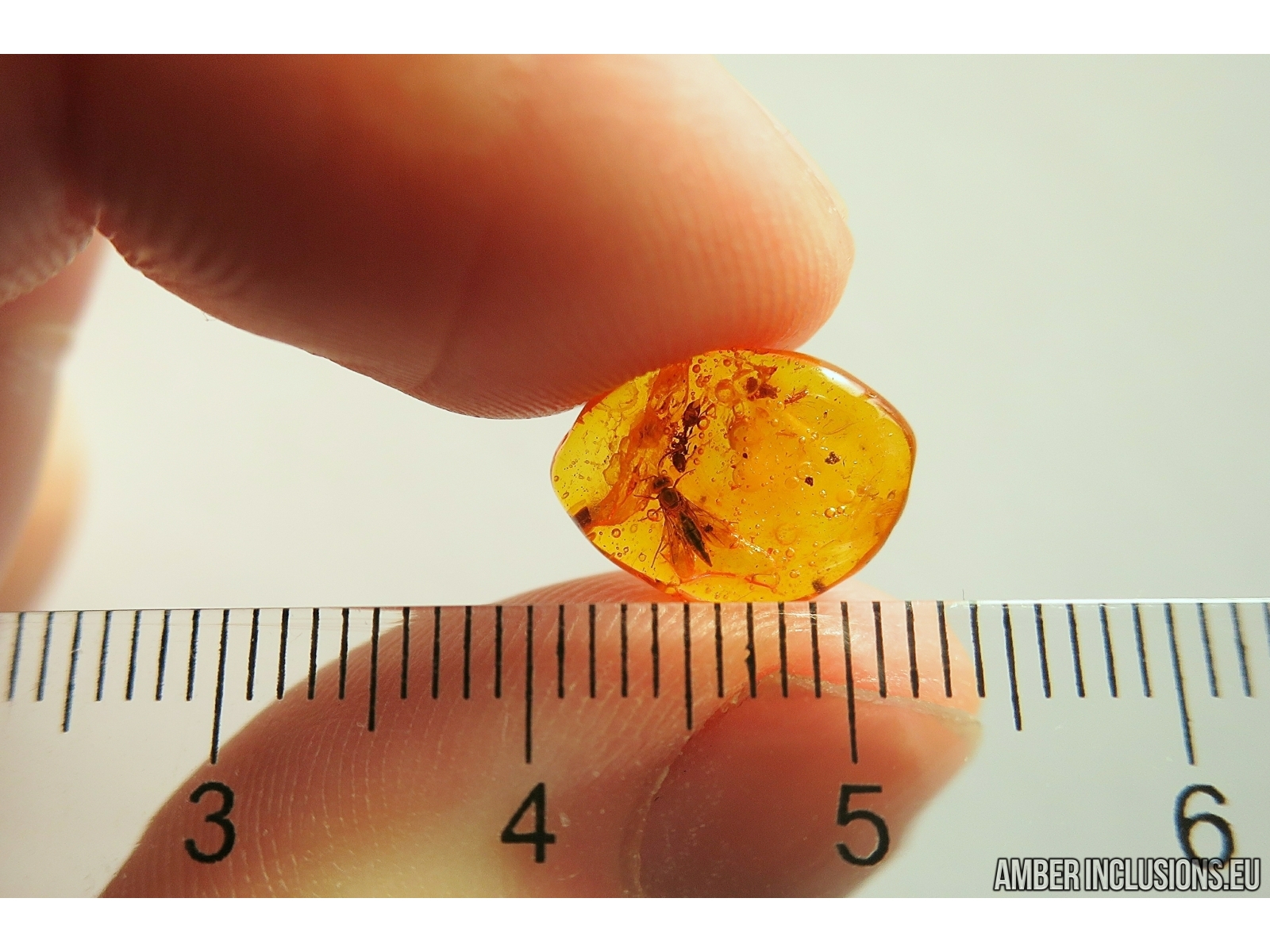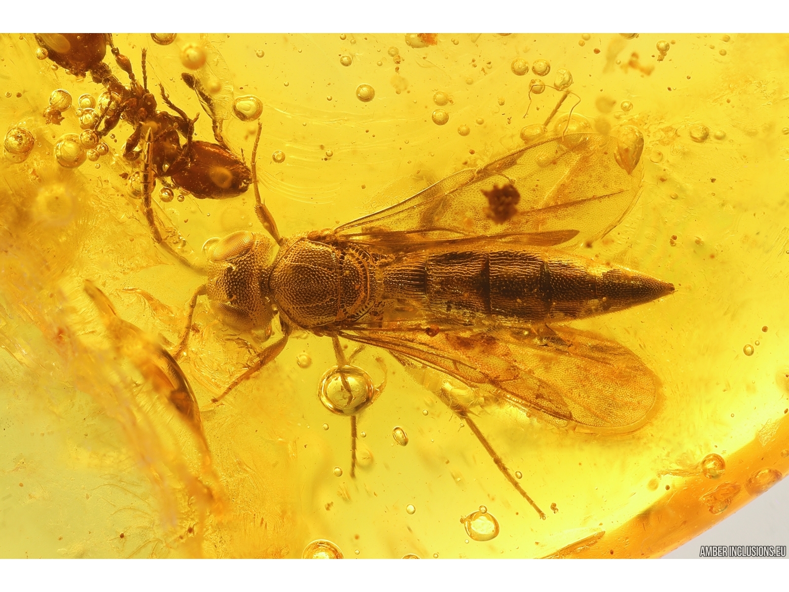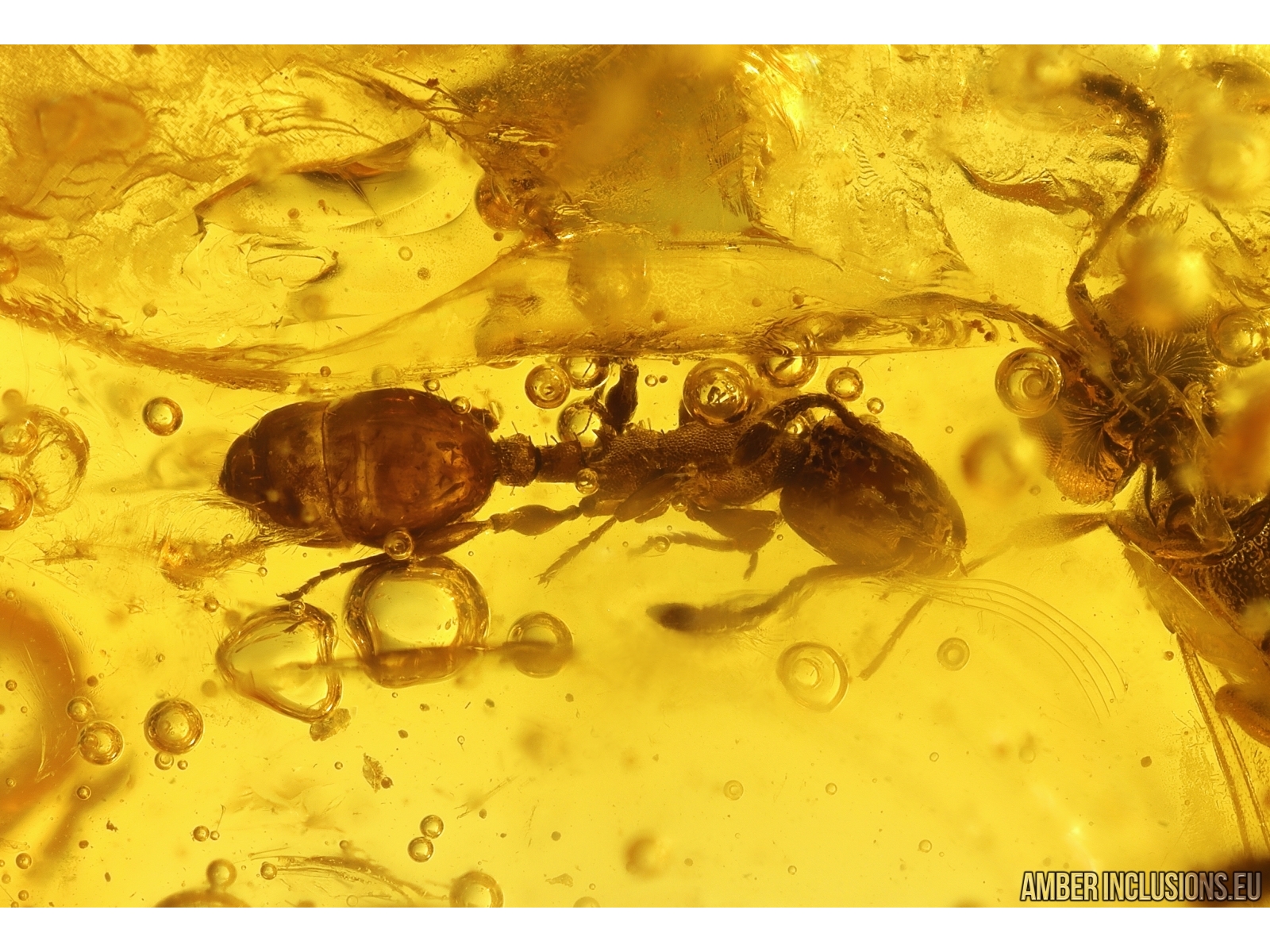 Baltic amber stone with fossil inclusions, trapped 34-56 million years ago - Rare Ant Formicidae Eotemnothorax gracilis and Wasp.