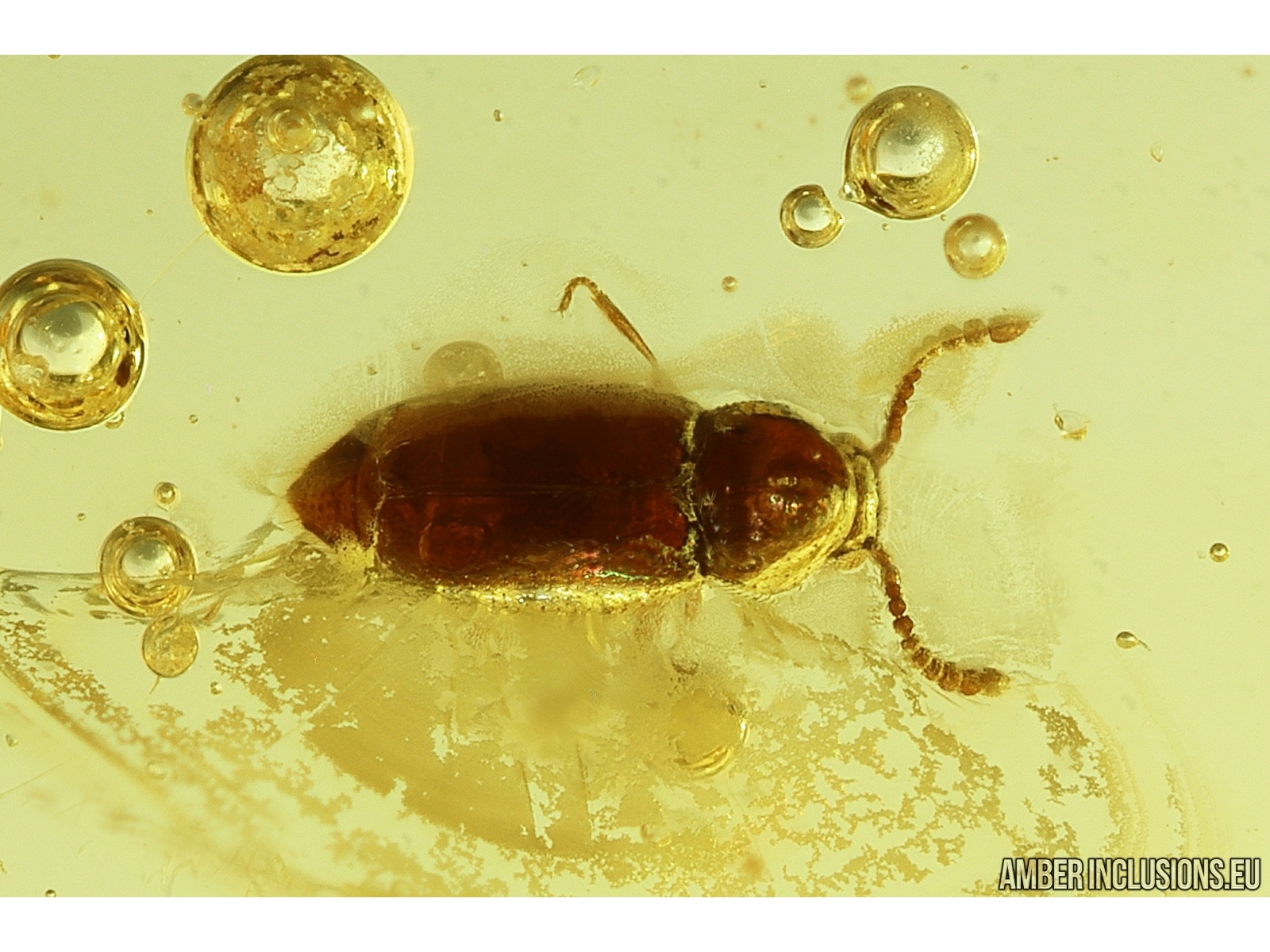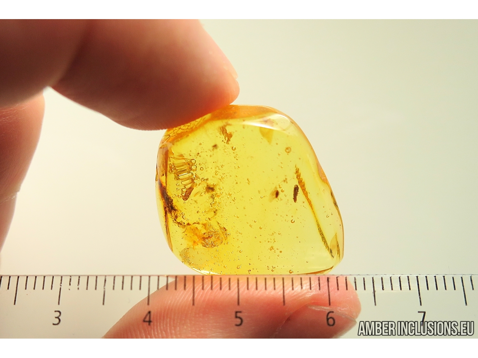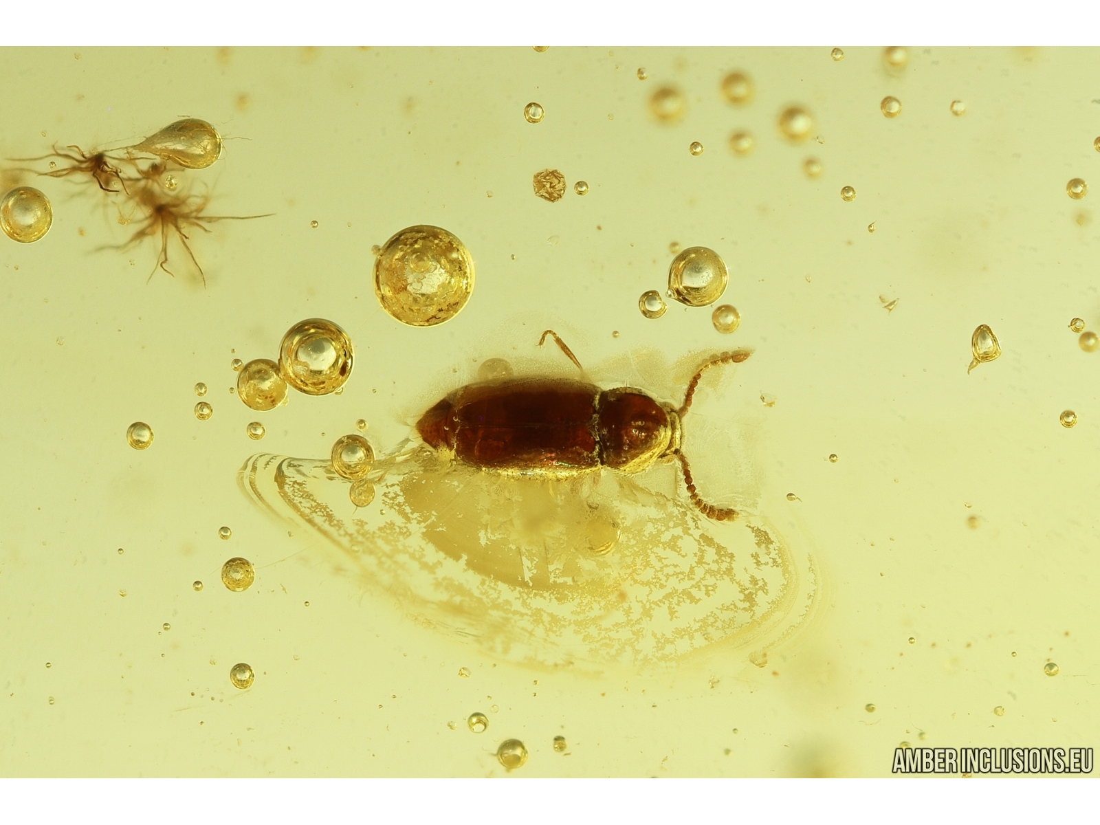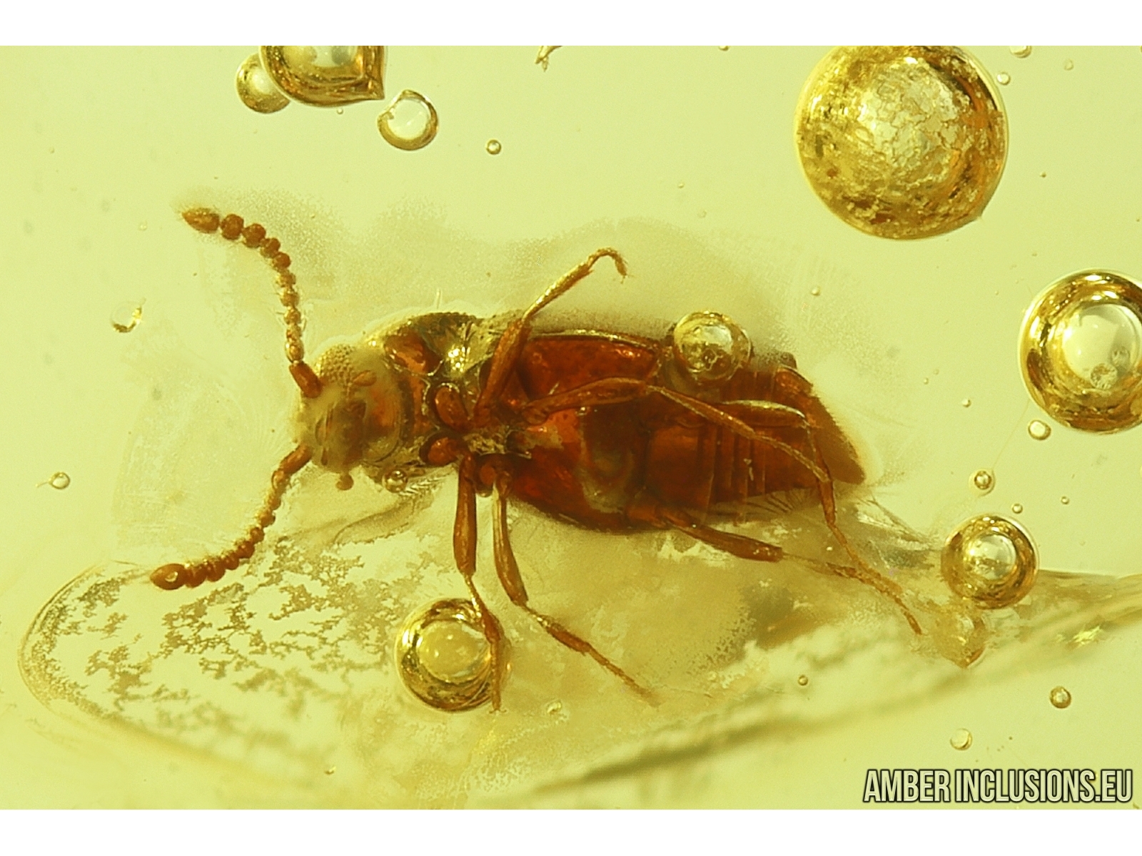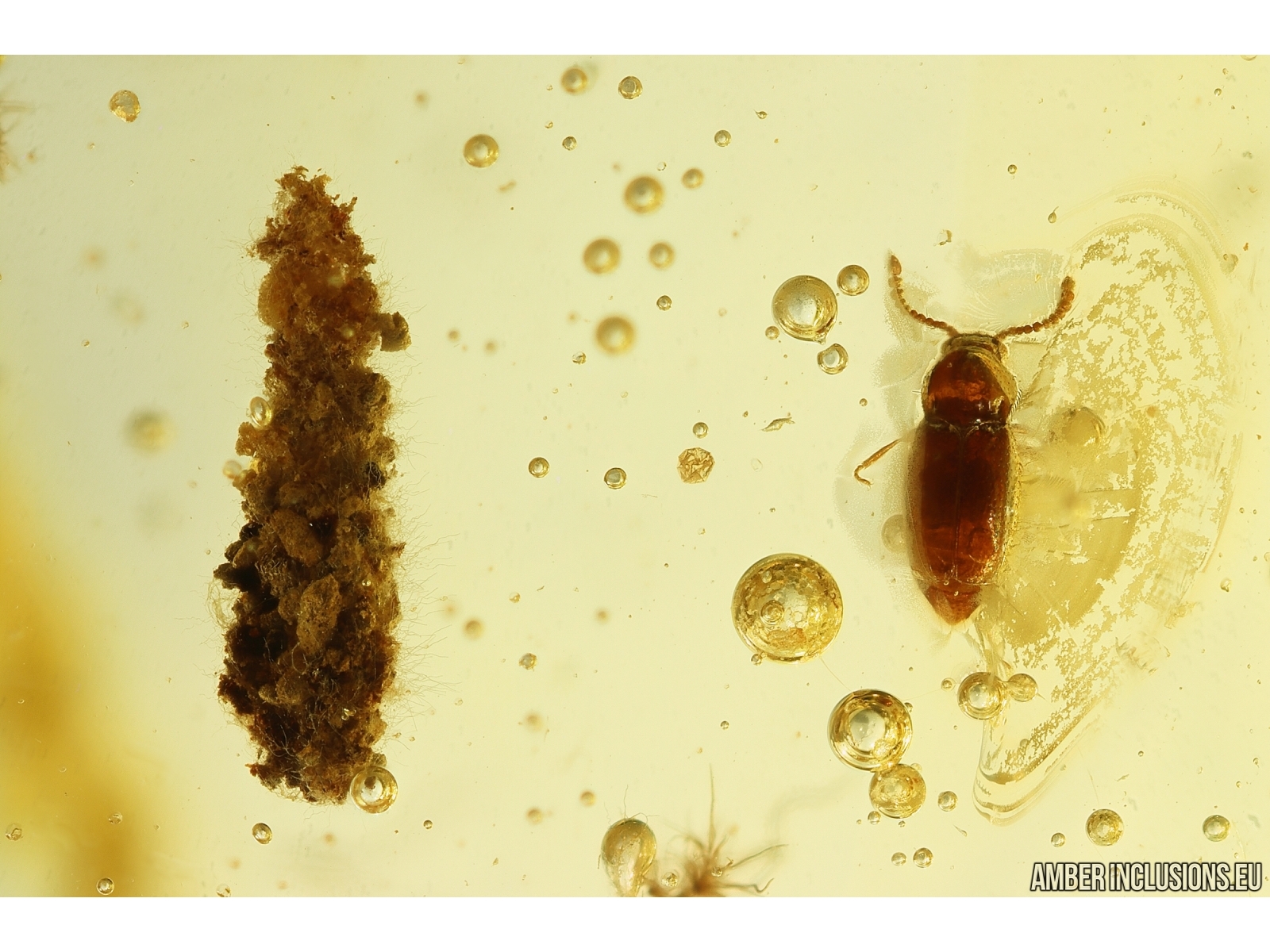 Ukrainian amber stone with fossil inclusion, trapped 34-56 million years ago -Rove beetle Staphylinidae and Caterpillar Case Lepidoptera.