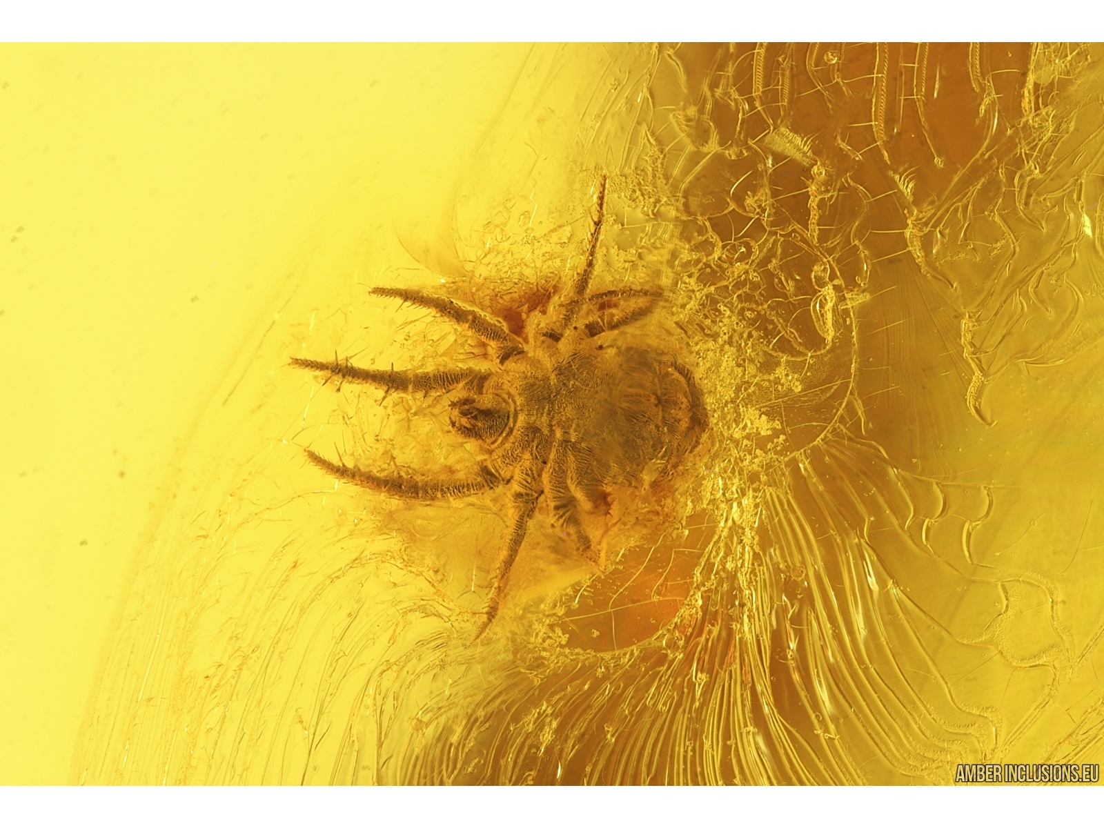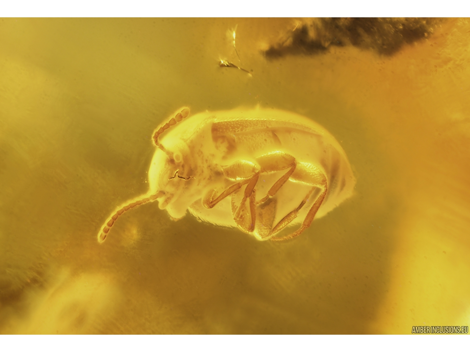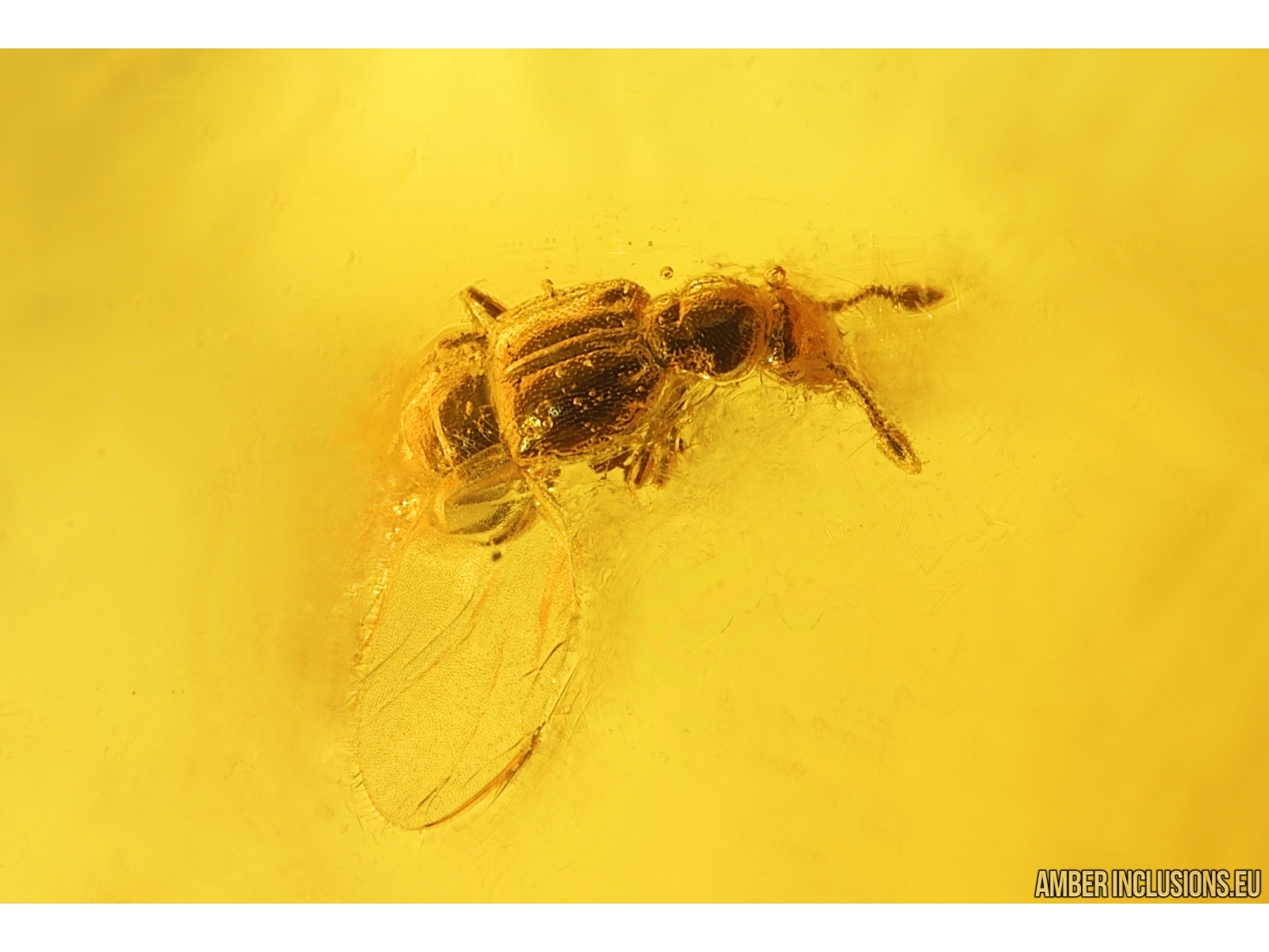 Baltic amber stone with fossil inclusions, trapped 34-56 million years ago -Rove beetle Staphylinidae Pselaphinae, Marsh Beetle Scirtidae and Mite Acari.