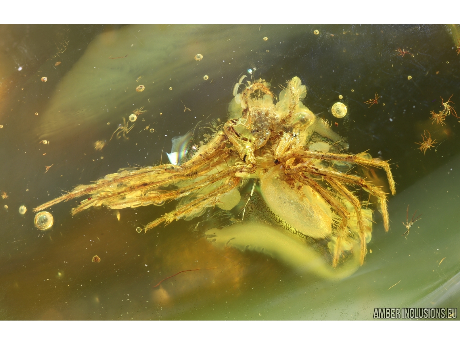 Baltic amber stone with fossil inclusion, trapped 34-56 million years ago - Spider and Gnat with Eggs.