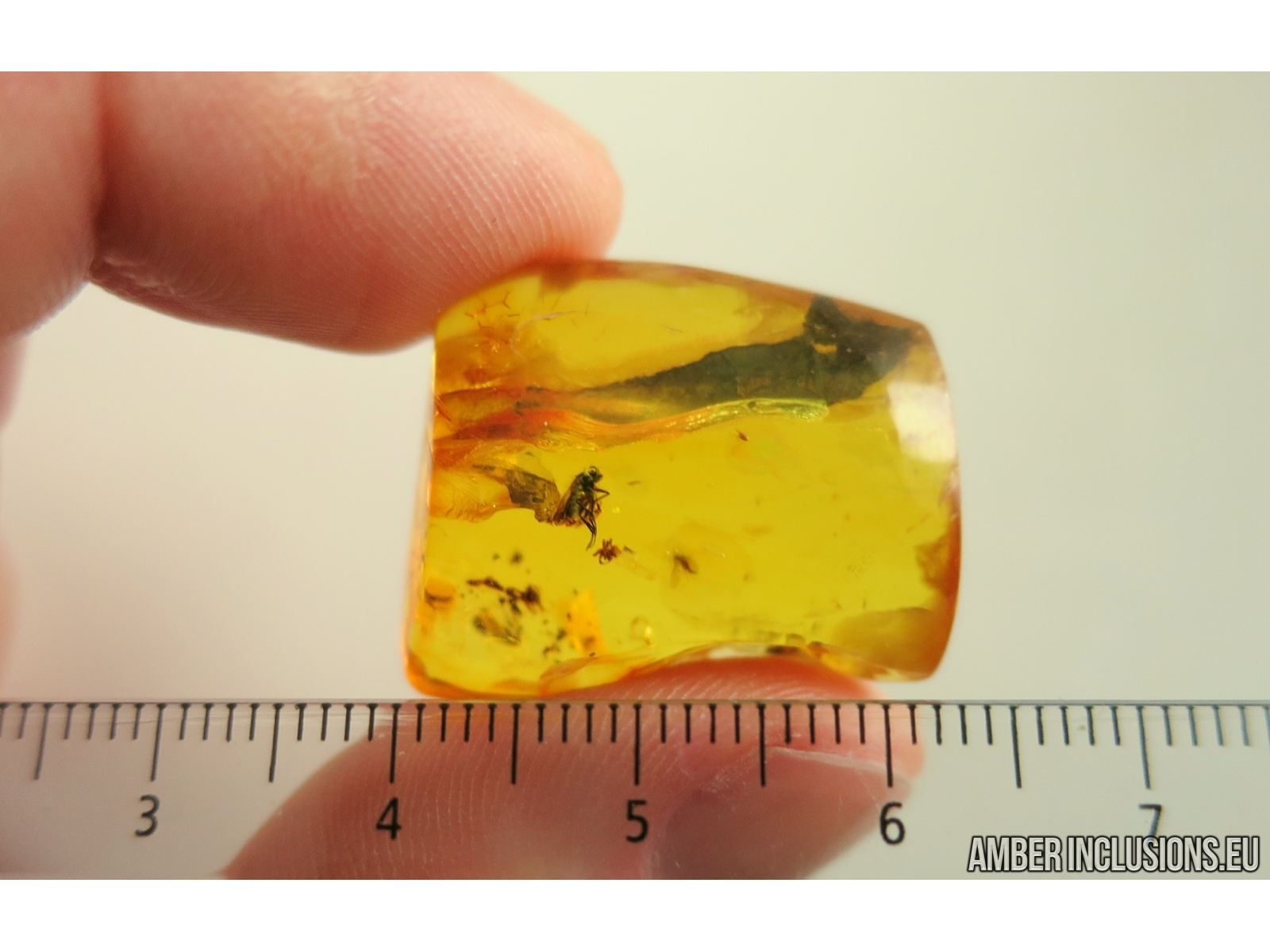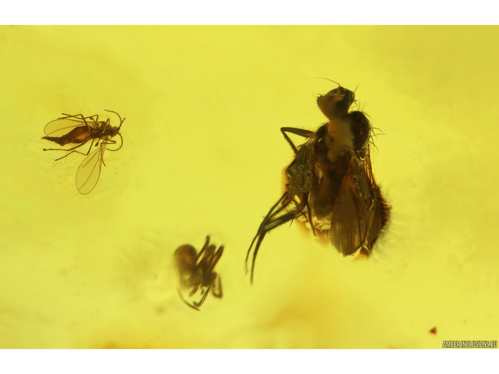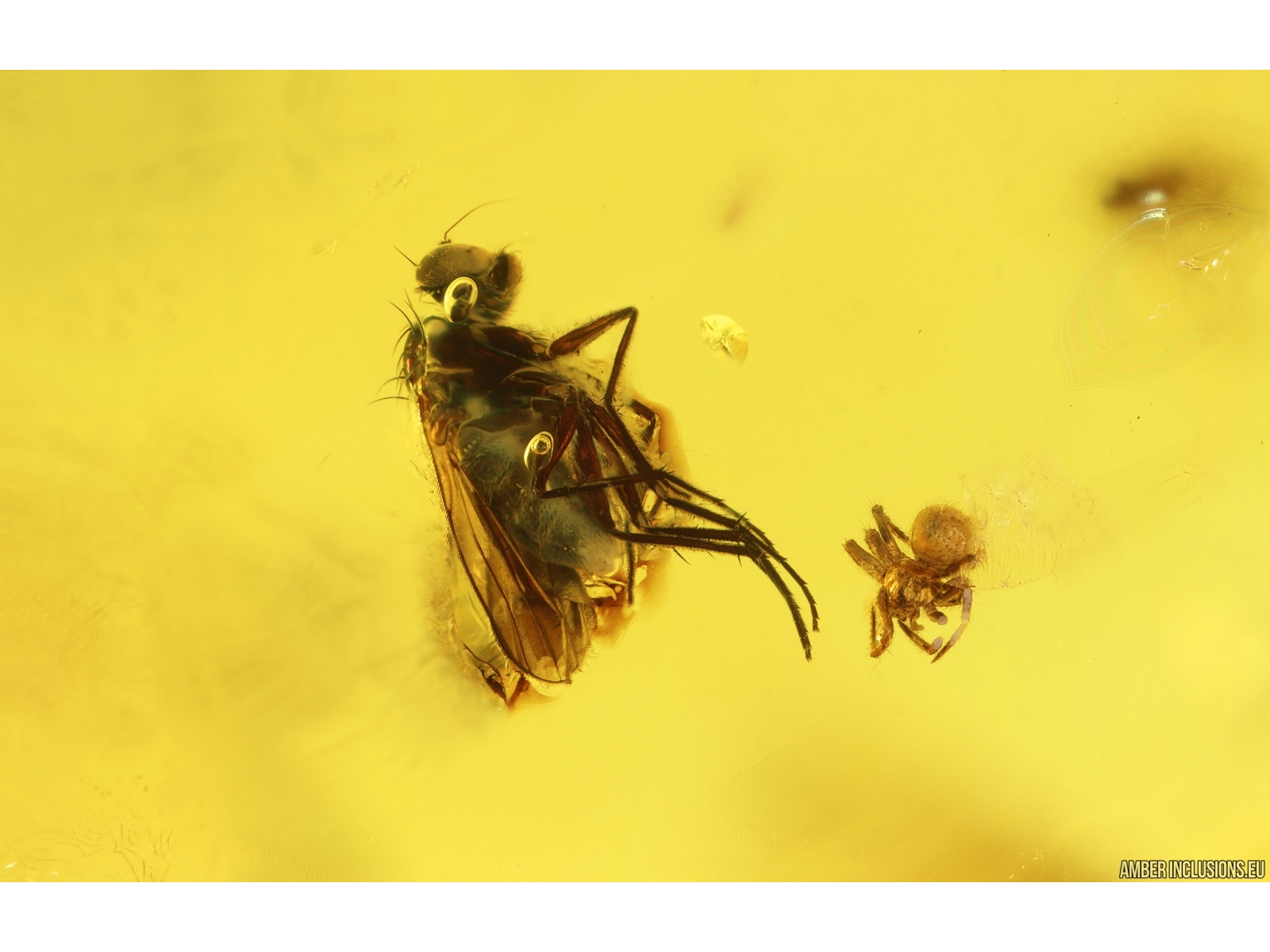 Baltic amber stone with fossil inclusions- Spider Araneae and Long-legged fly Dolichopodidae.