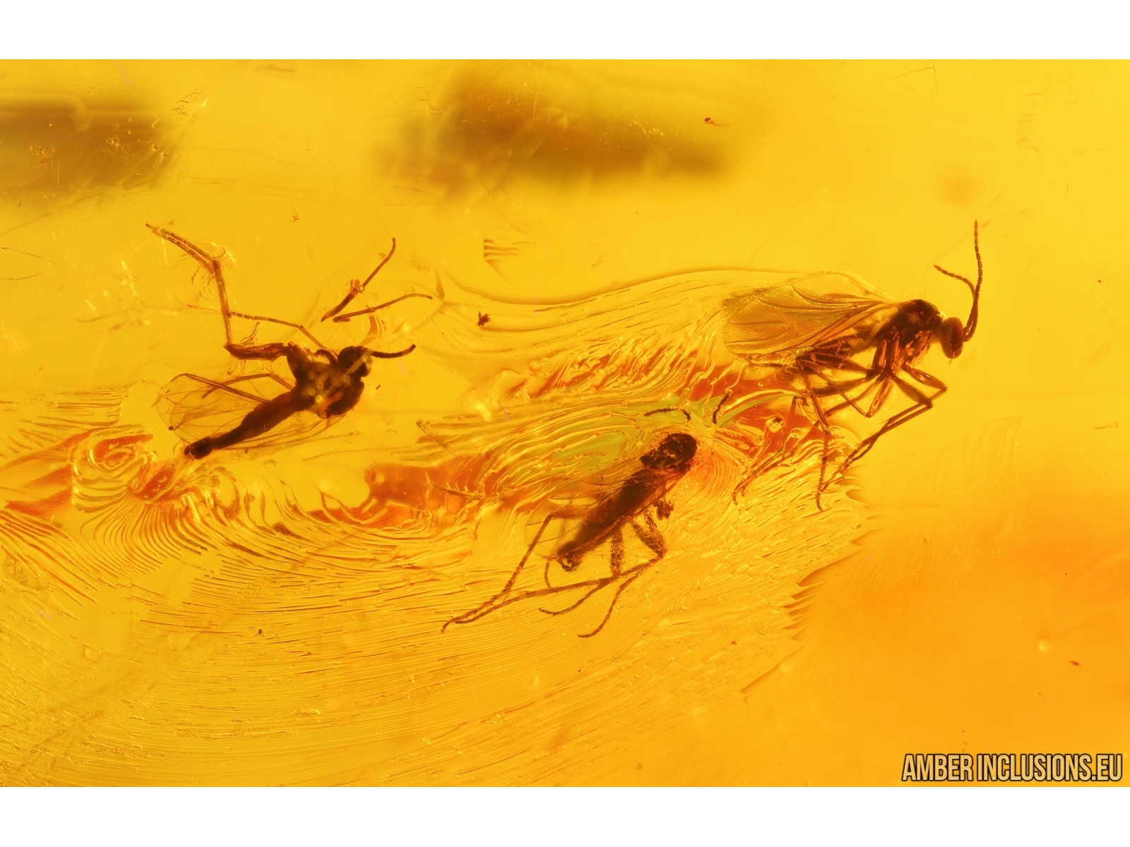 Big Baltic amber stone with fossil inclusions, trapped 34-56 million years ago - Svarm of Dark-Winged fungus gnats Sciaridae.