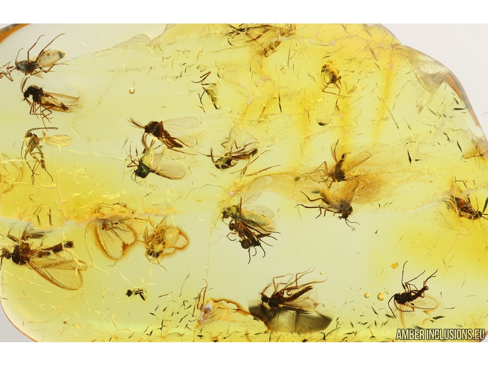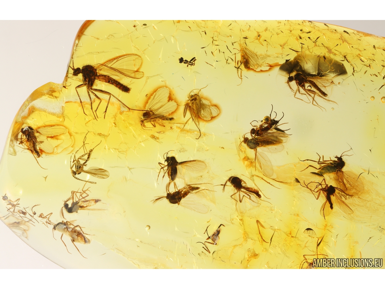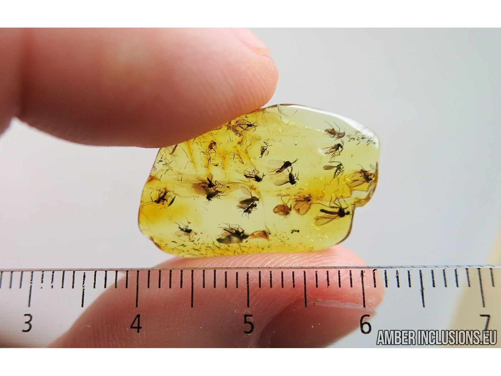 Baltic amber stone with fossil insects - Swarm of Dark-Winged fungus gnats Sciaridae.
