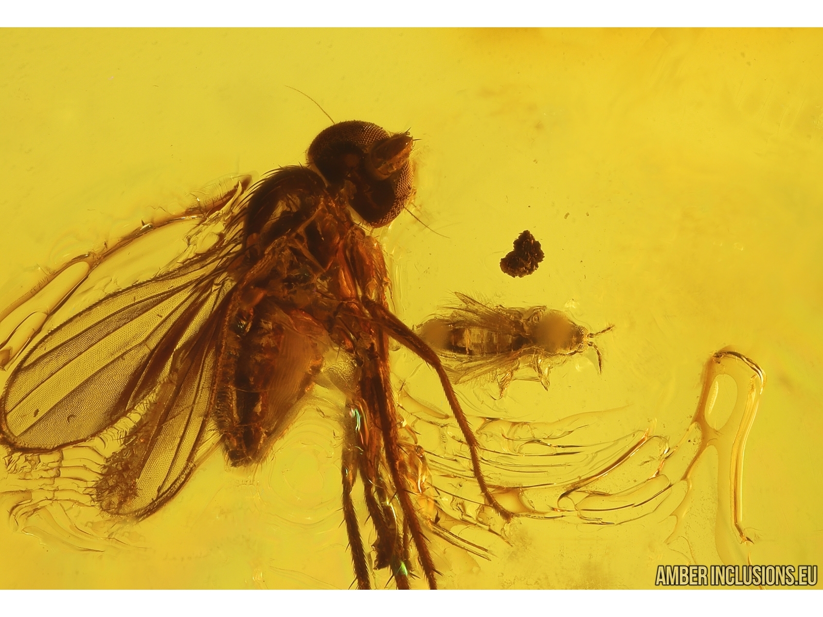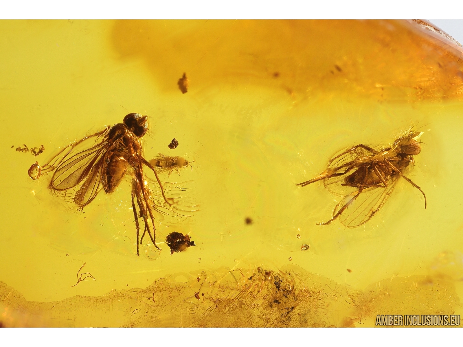 Baltic amber stone with fossil inclusions, trapped 34-56 million years ago - Two Long-legged fly Dolichopodidae and Thrips.