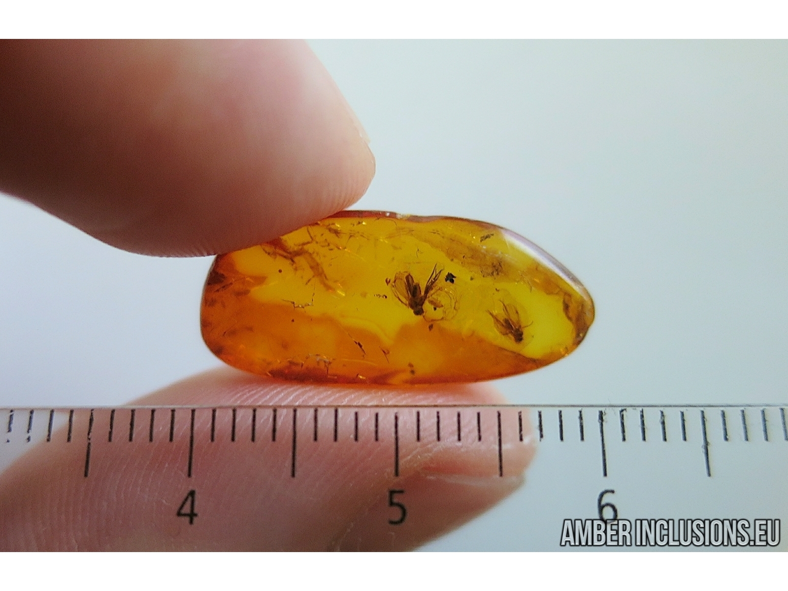 It weighs 0.6 g. Measurements of stone 20x10x4mm, length of each fly ~2.5mm, thrips ~1mm.