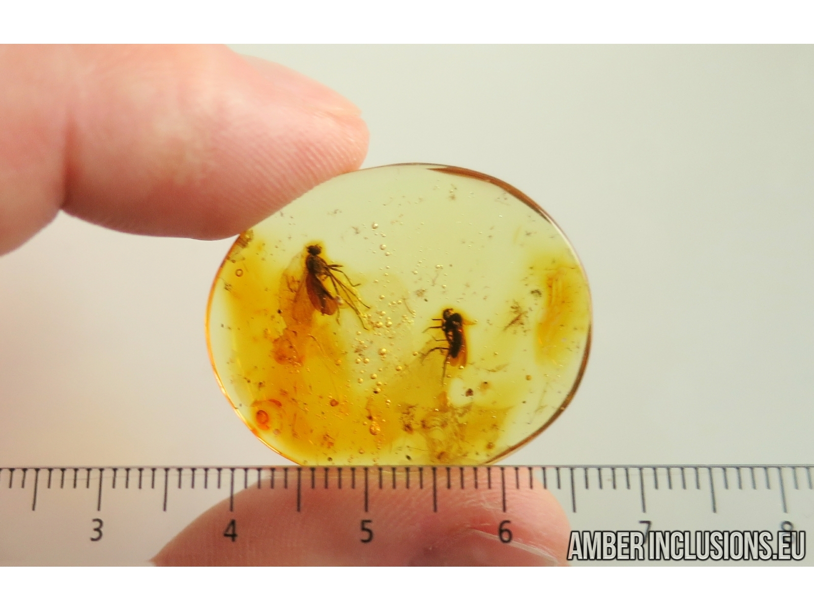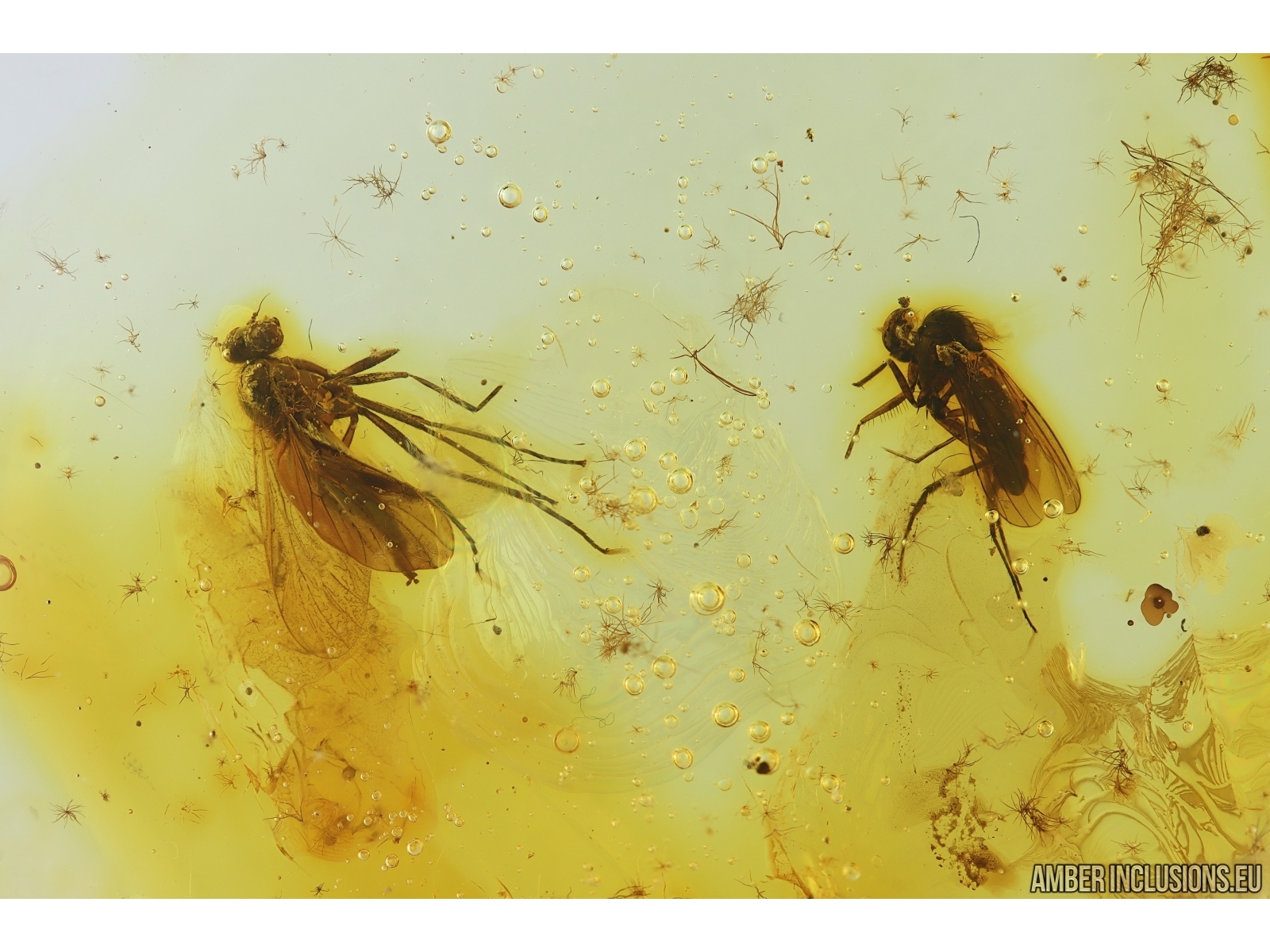 Baltic amber stone with fossil inclusions, trapped 34-56 million years ago - Two Long-legged flies Dolichopodidae.