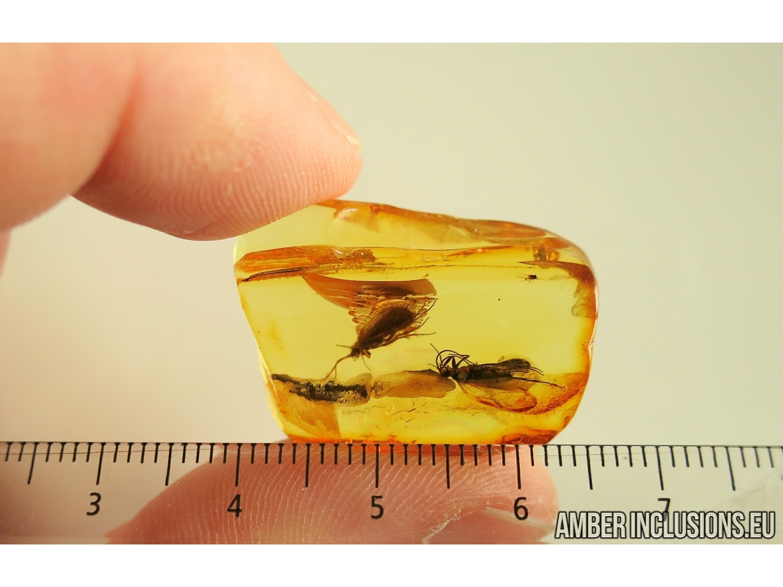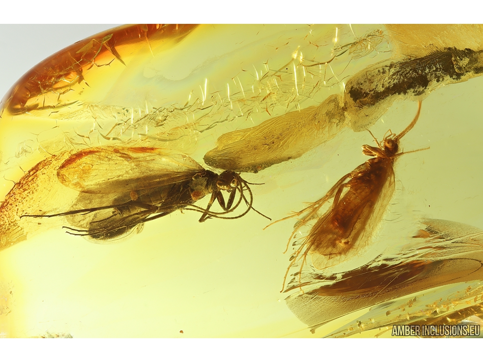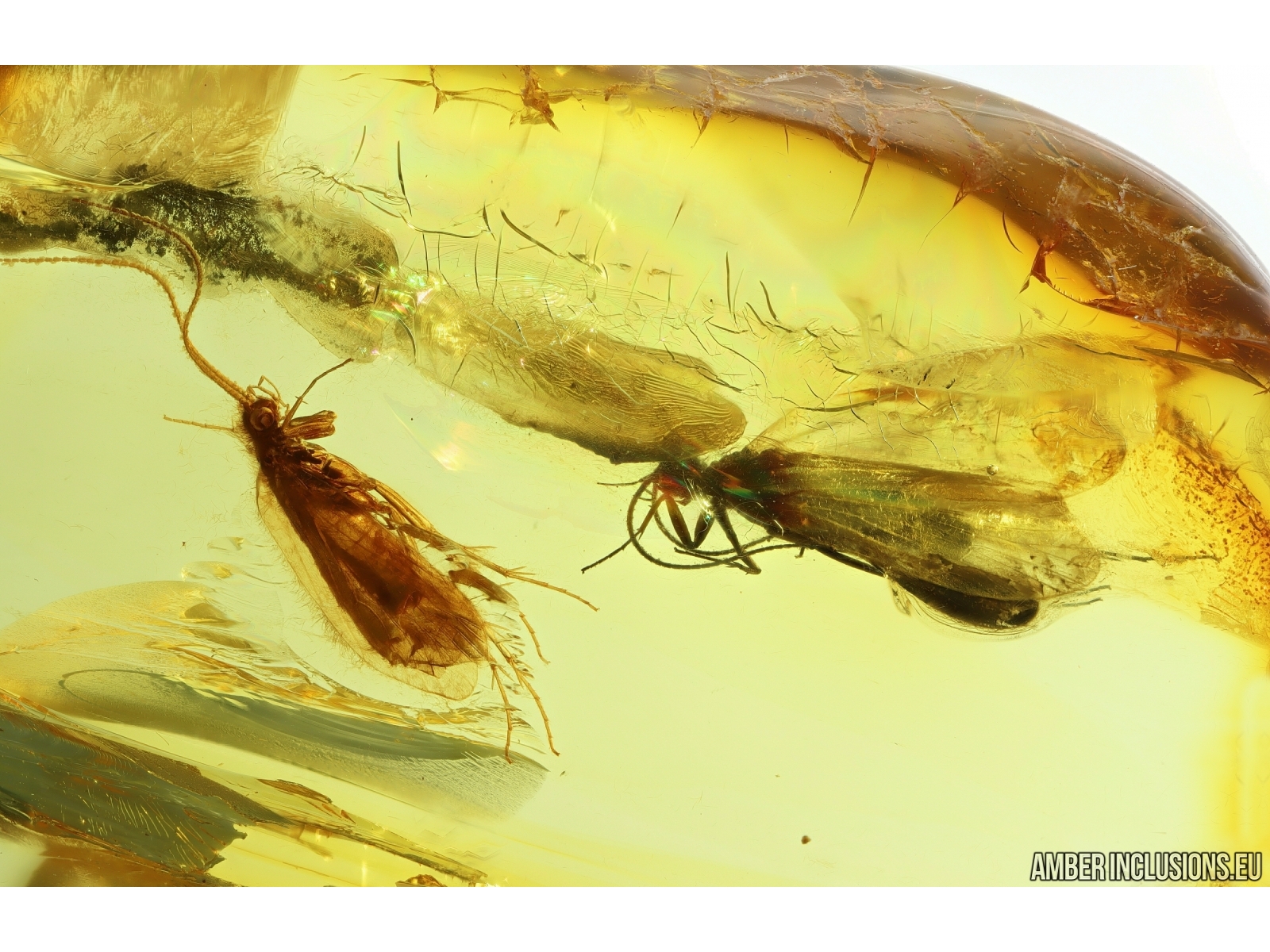 Baltic amber stone with fossil inclusions- Two Nice Caddisflies Trichoptera.
