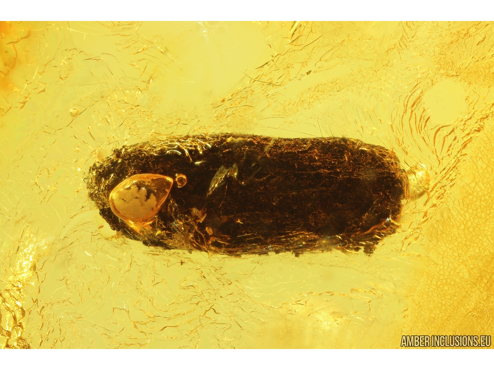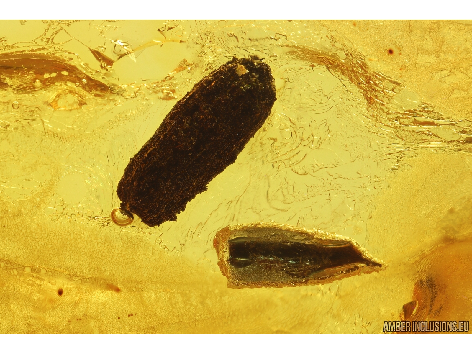 Baltic amber stone with fossil inclusions, trapped 34-56 million years ago - Two Plants (1 possibly coprolite) .