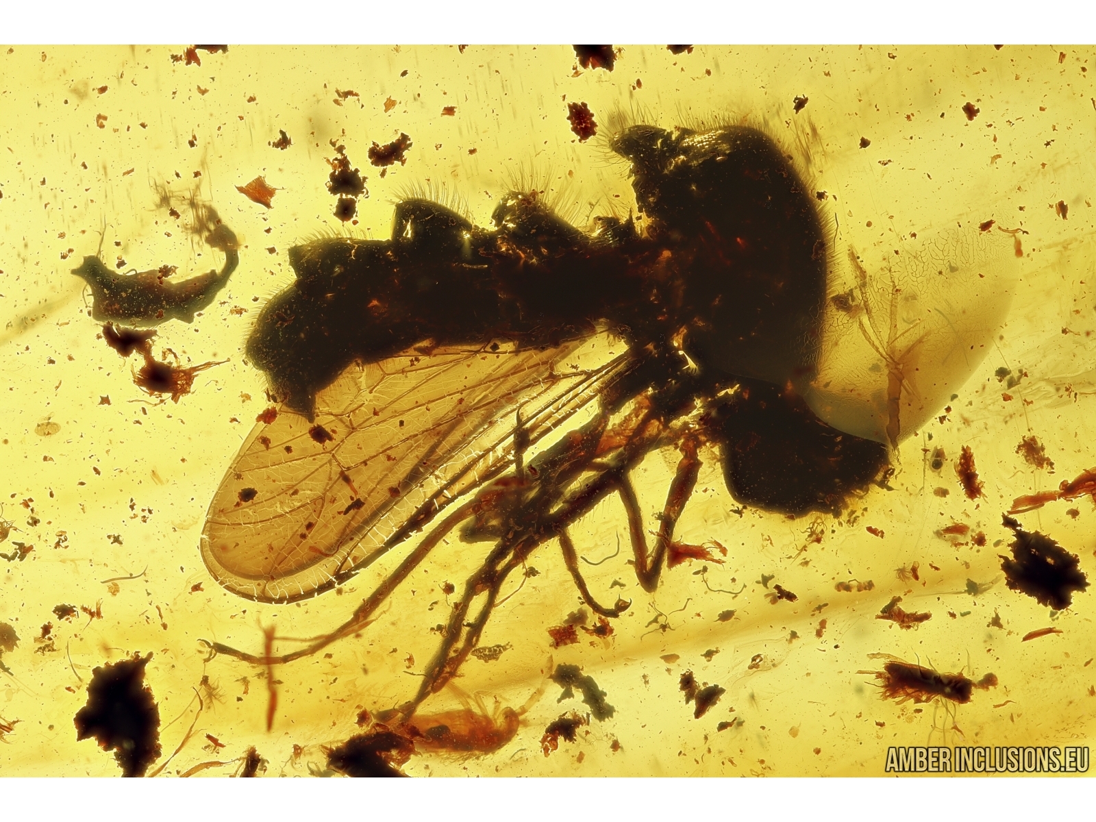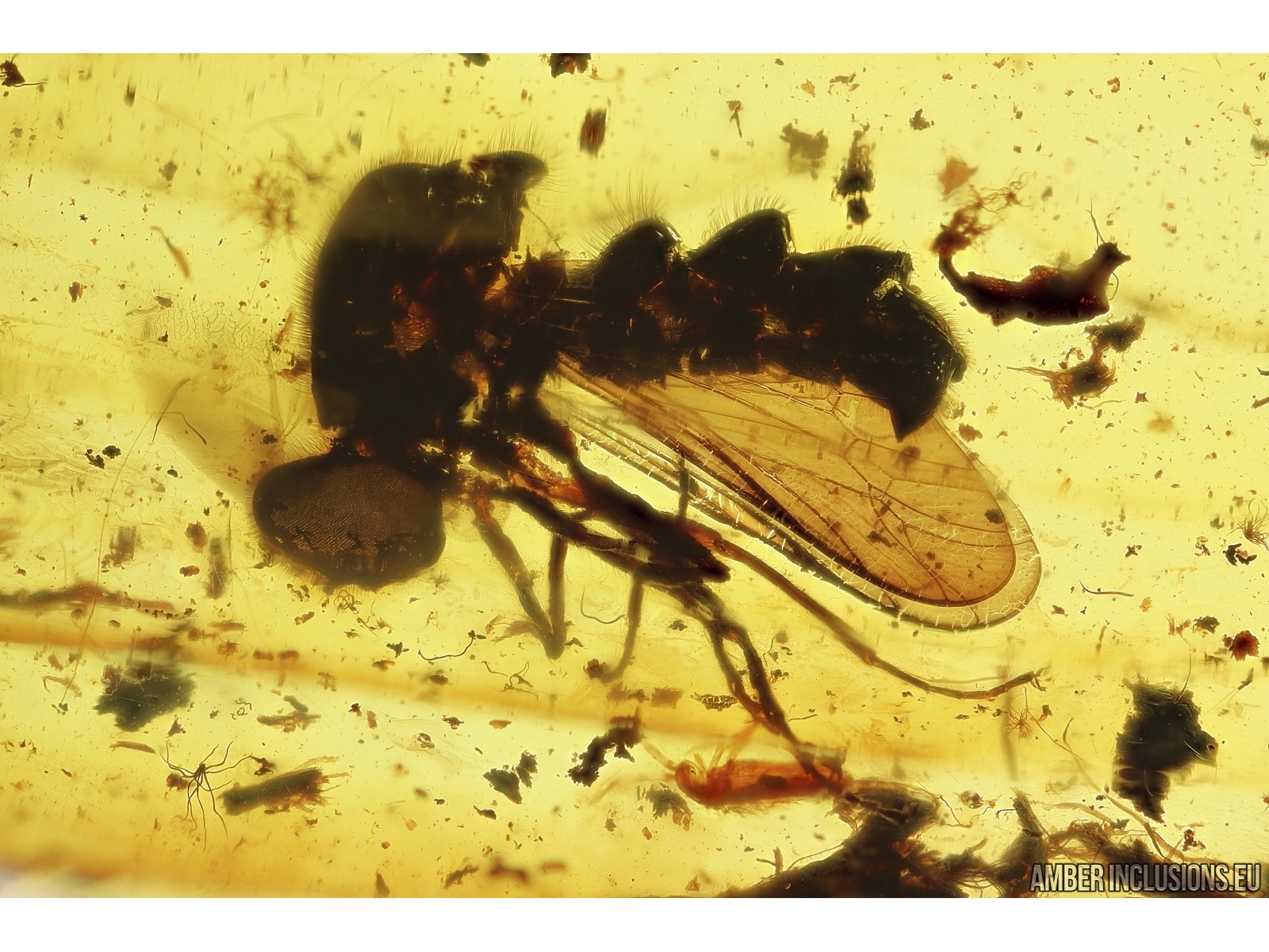 Baltic amber stone with fossil inclusions, trapped 34-56 million years ago - Two Rare Small-headed Flies (Spider flies) Acroceridae.