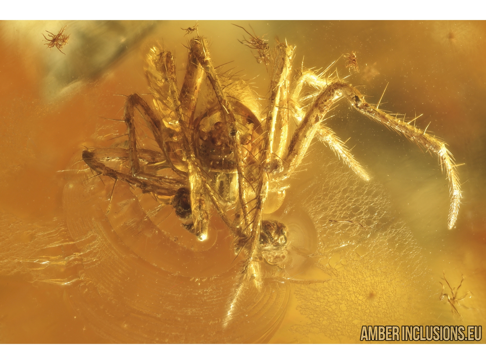 Ukrainian Rovno amber stone with fossil inclusions, trapped 34-56 million years ago - Two Spiders Araneae Mimetidae, Mite Acari and More.