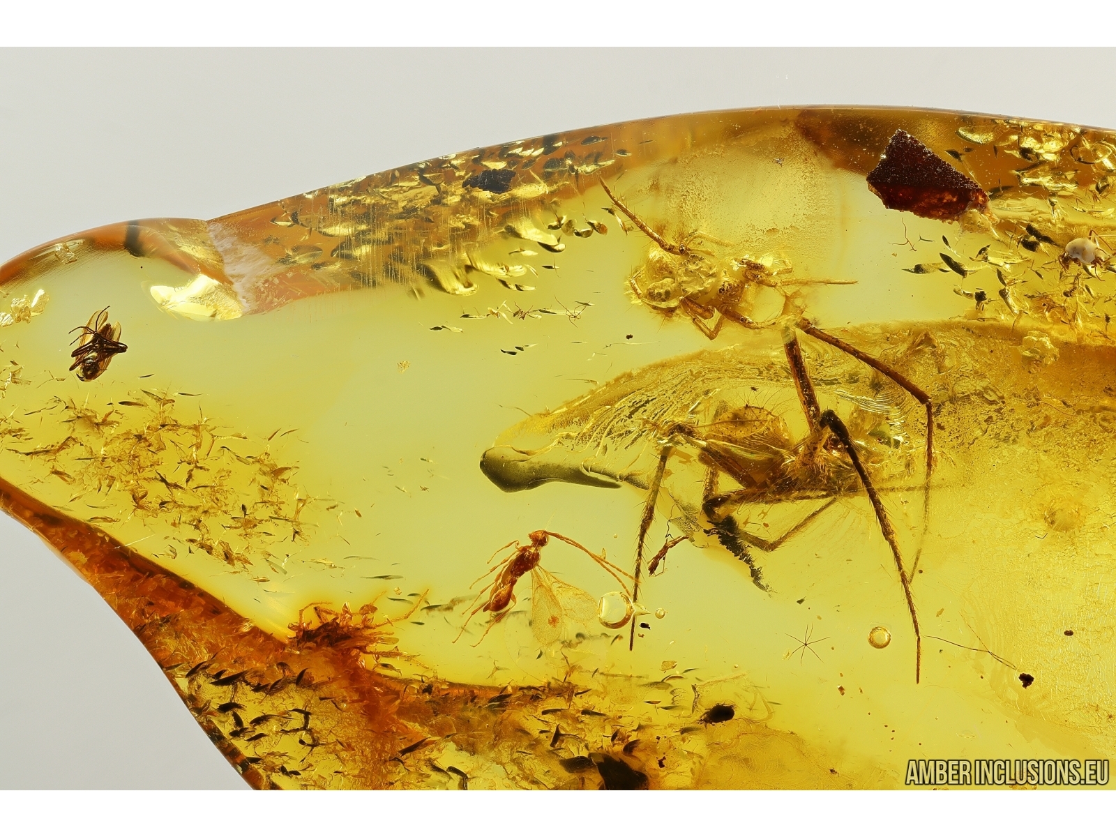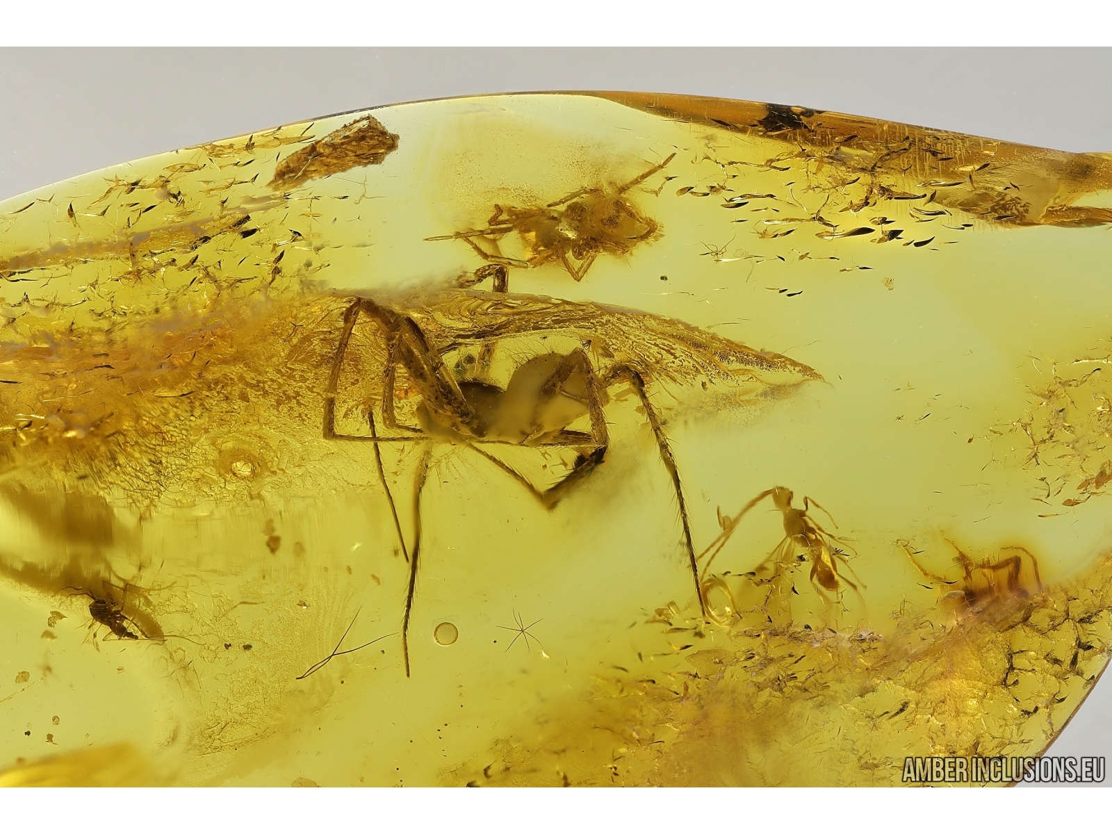 Ukrainian Rovno amber stone with fossil inclusions, trapped 34-56 million years ago -Two Spiders Araneae, Wasp Hymenoptera and More.