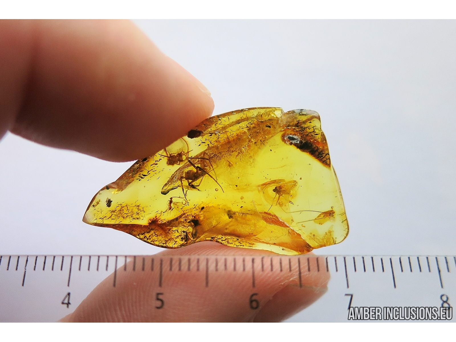 It weighs 1.6 g. Measurements of stone 32x20x6mm, length of spiders 3-7mm, wasp ~2mm.