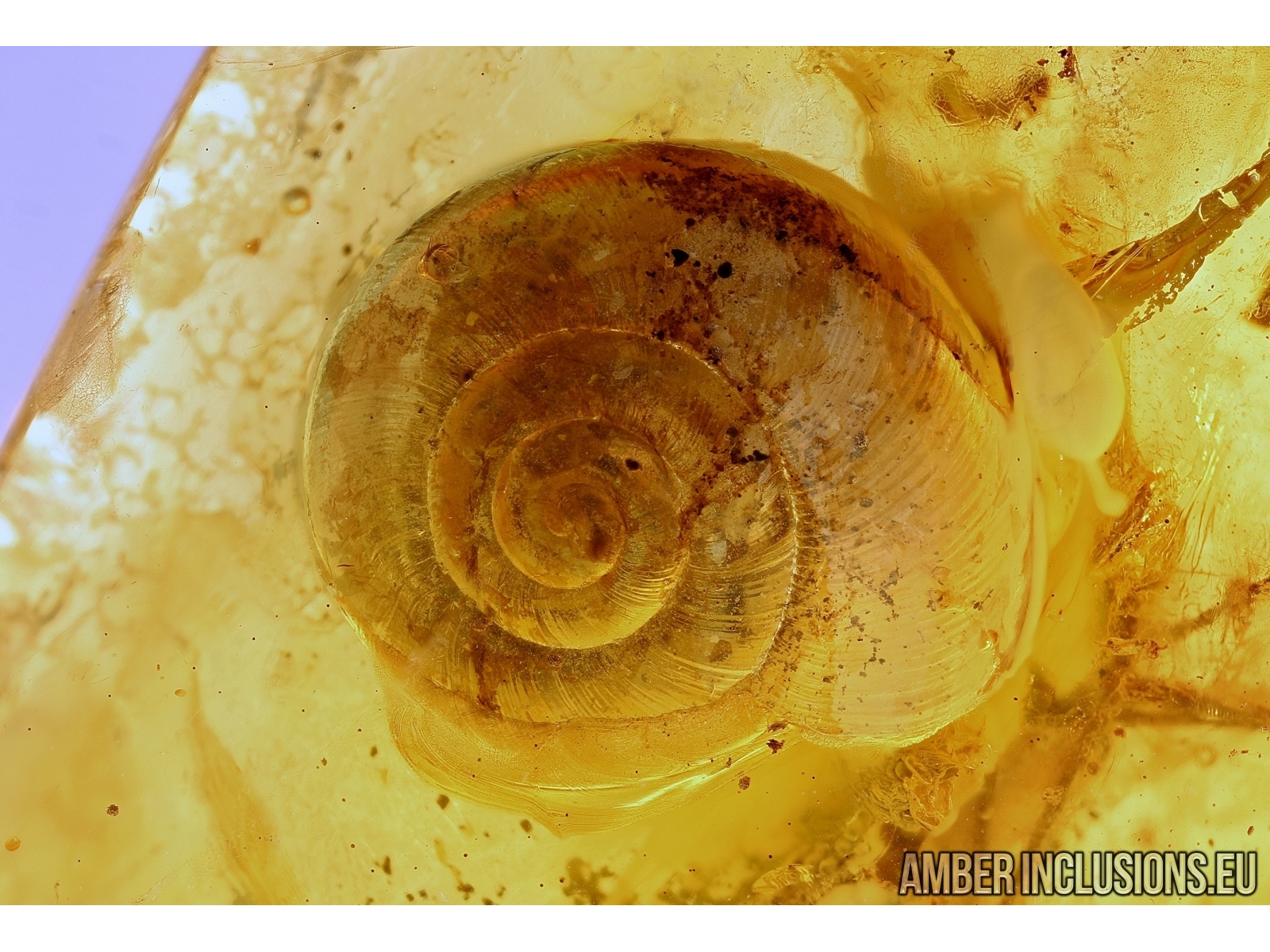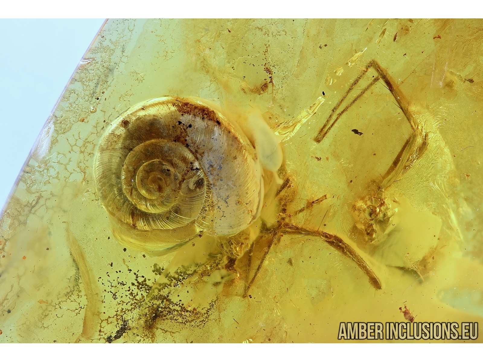 Baltic amber stone with fossil inclusions - SNAIL SHELL, GASTROPODA, Spider and Ant.