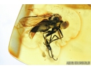 Baltic amber stone with fossil inclusions, trapped 34-56 million years ago - Very Nice Rare Praying Mantis, Mantodea and Dance fly Empididae.